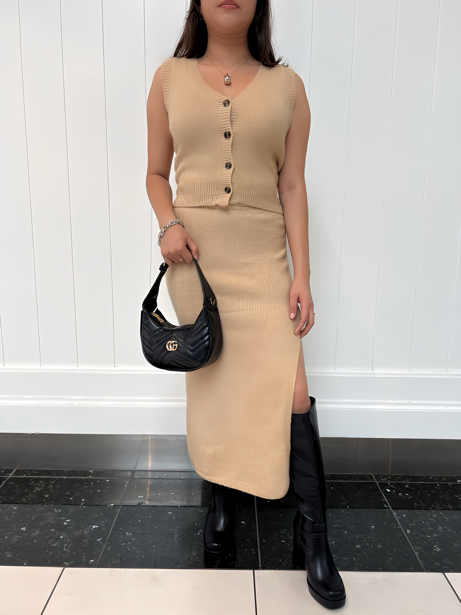 The Autumn Chic Skirt Set brings a sophisticated yet cozy touch to your fall wardrobe. This two-piece set features a sleeveless button-up top and a matching midi skirt, designed to keep you effortlessly stylish and comfortable. With its sleek silhouette and subtle side slit, this set is perfect for transitioning between day and night.