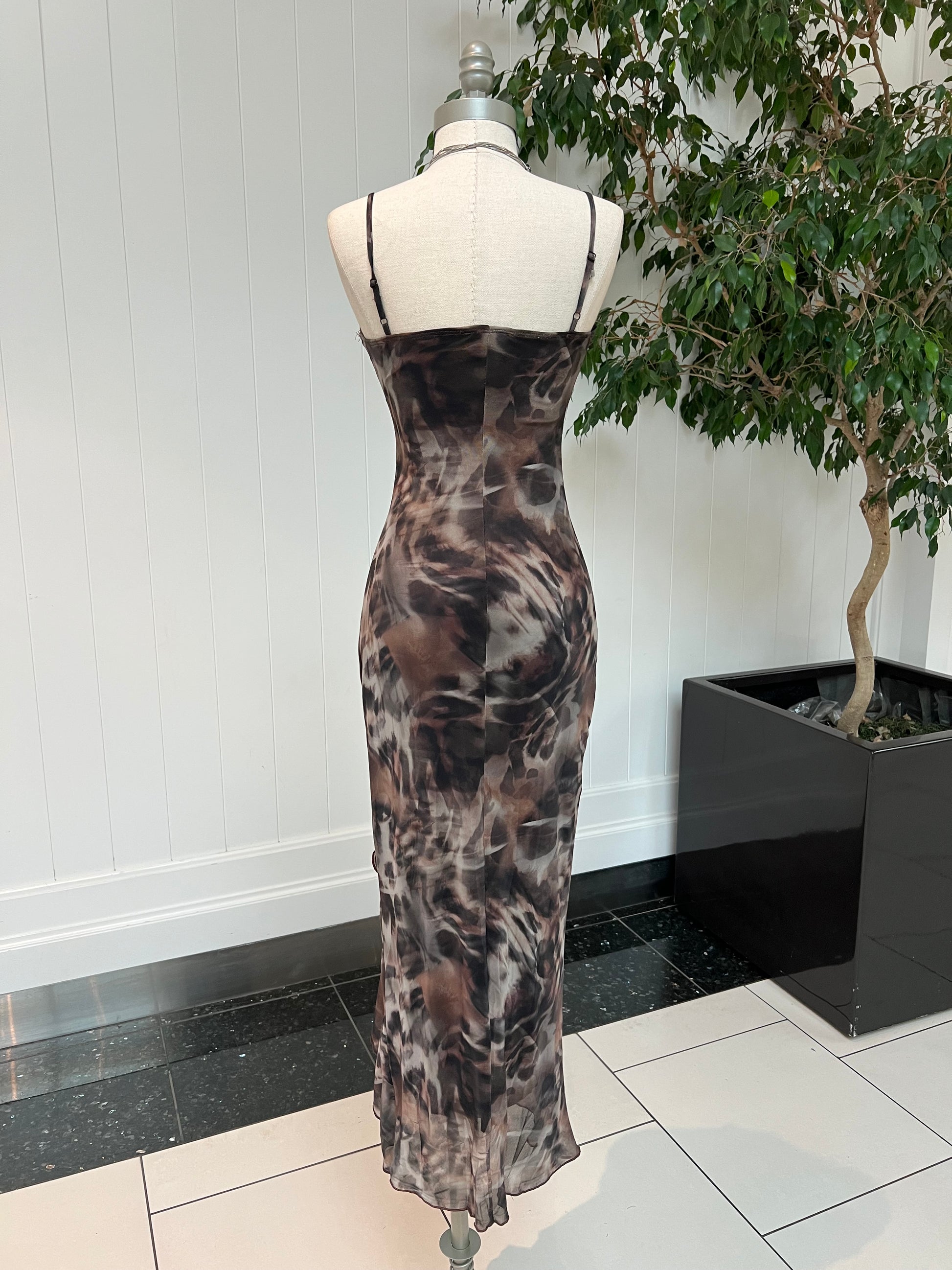 Get ready to turn heads with our Autumn Elegance Dress! Featuring a stunning mesh double lined ruffle leg slit and a fierce leopard print all over, this dress is perfect for a dinner date. And with the added padding bra, you'll feel confident and elegant all night long!
