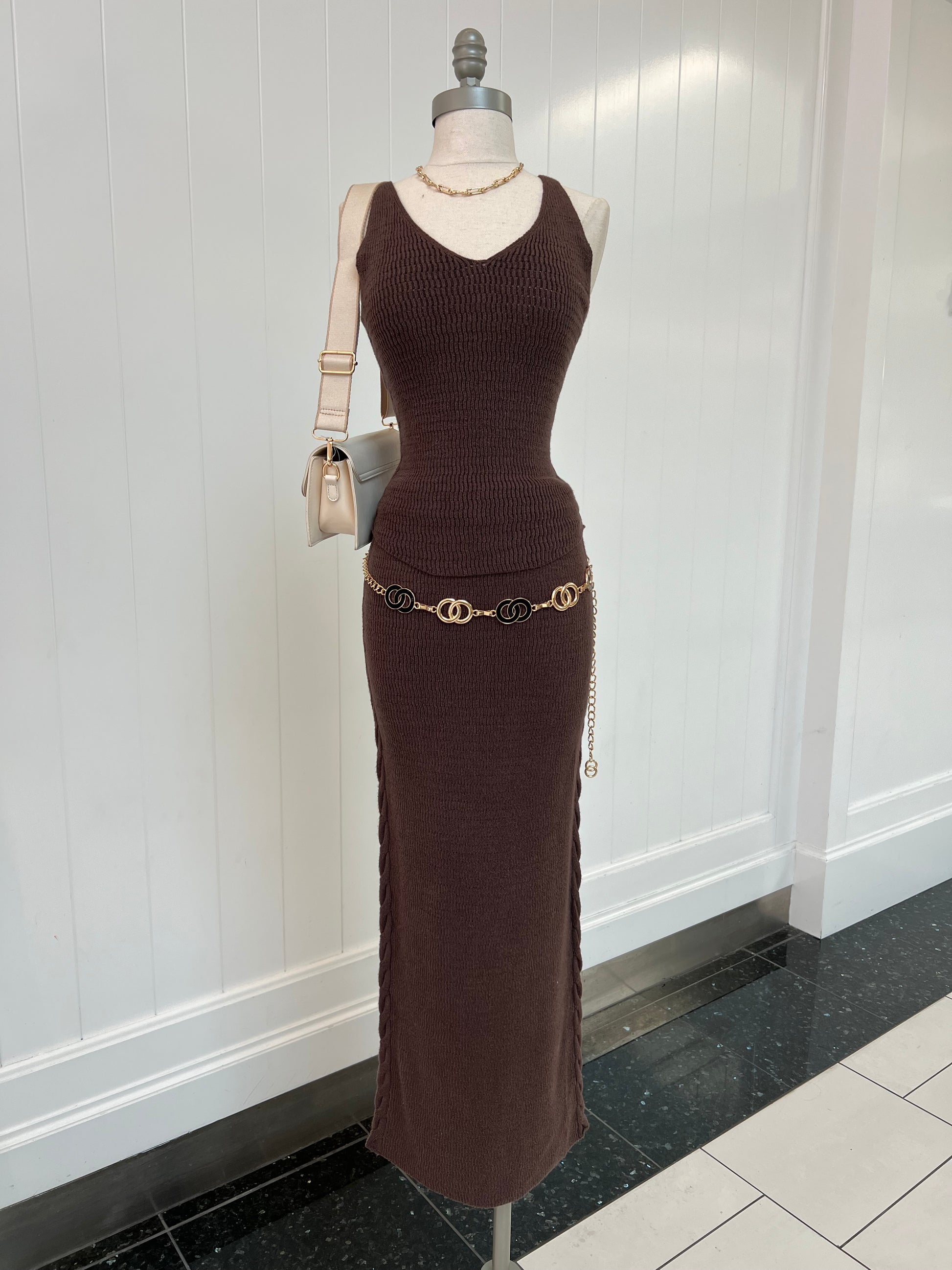 This set captures the cozy vibes of autumn in New York with its knitted texture and full-body coverage. The adjustable straps and elastic waistband offer a comfortable fit while the v neckline adds a touch of femininity. Perfect for chilly days, this set is sure to inspire feelings of warmth and comfort.
