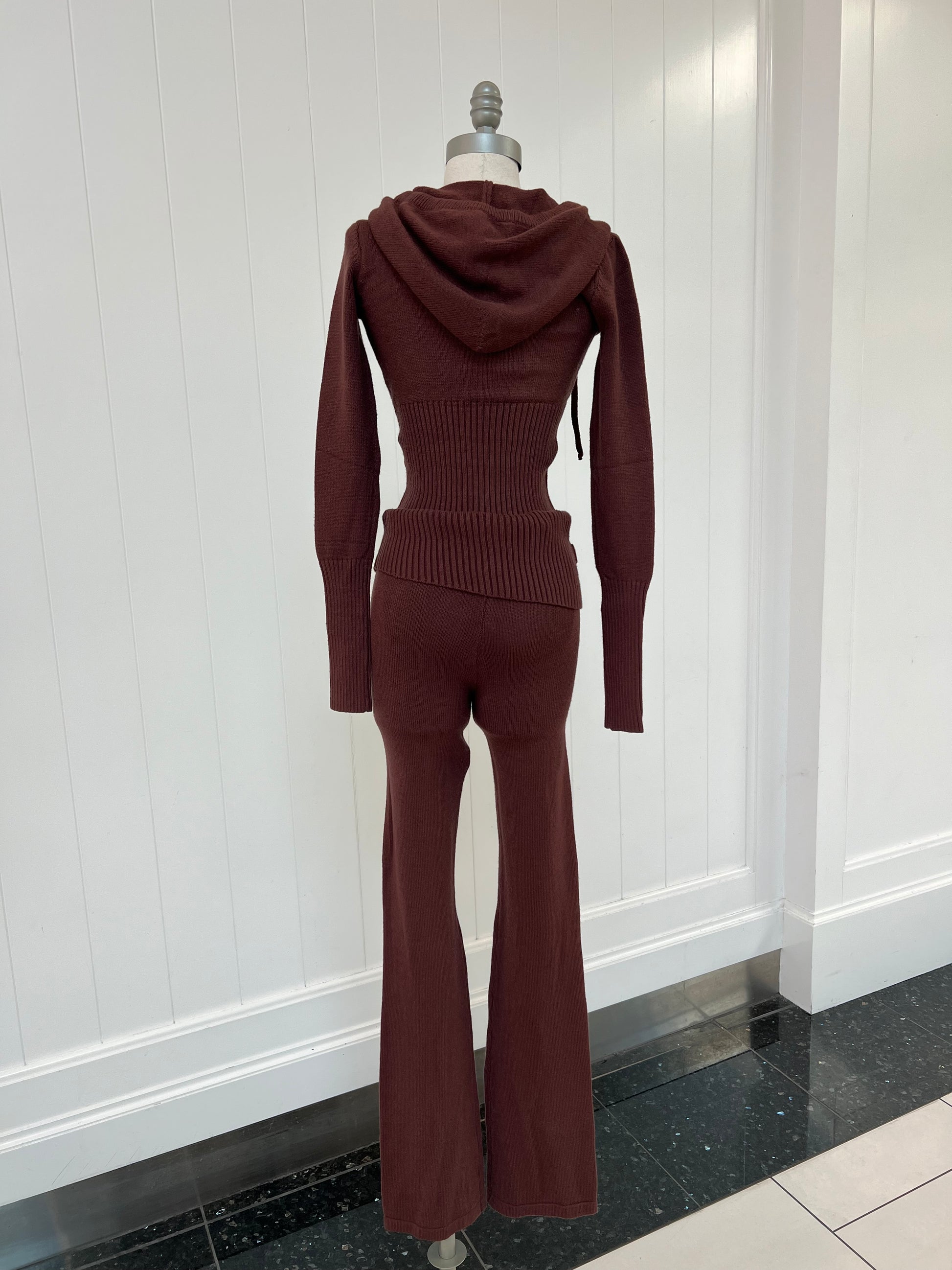 Elevate your fall wardrobe with our Trendy Travels Set! This knit matching pant set features flare pants with an adorable overlapped layer and buckle detail, paired with a matching zip up hood sweater. Stay stylish and comfortable while running errands or traveling.