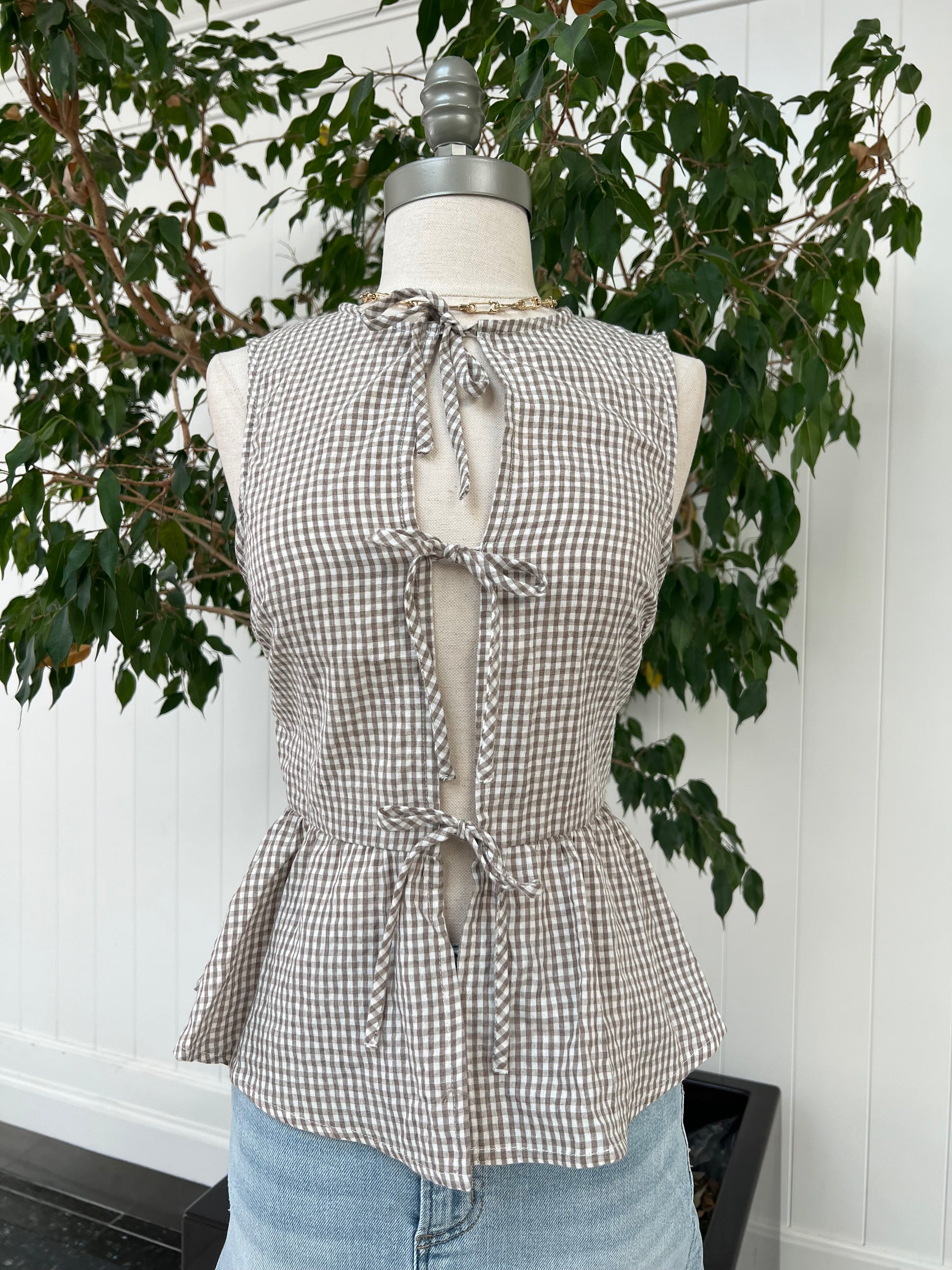 Experience the perfect blend of flirty and sexy with our Sunny Gingham Top! This light weight, sleeveless top features a playful silhouette with a flared bottom and unique three tie design that shows a hint of skin. A must-have for your next outing!