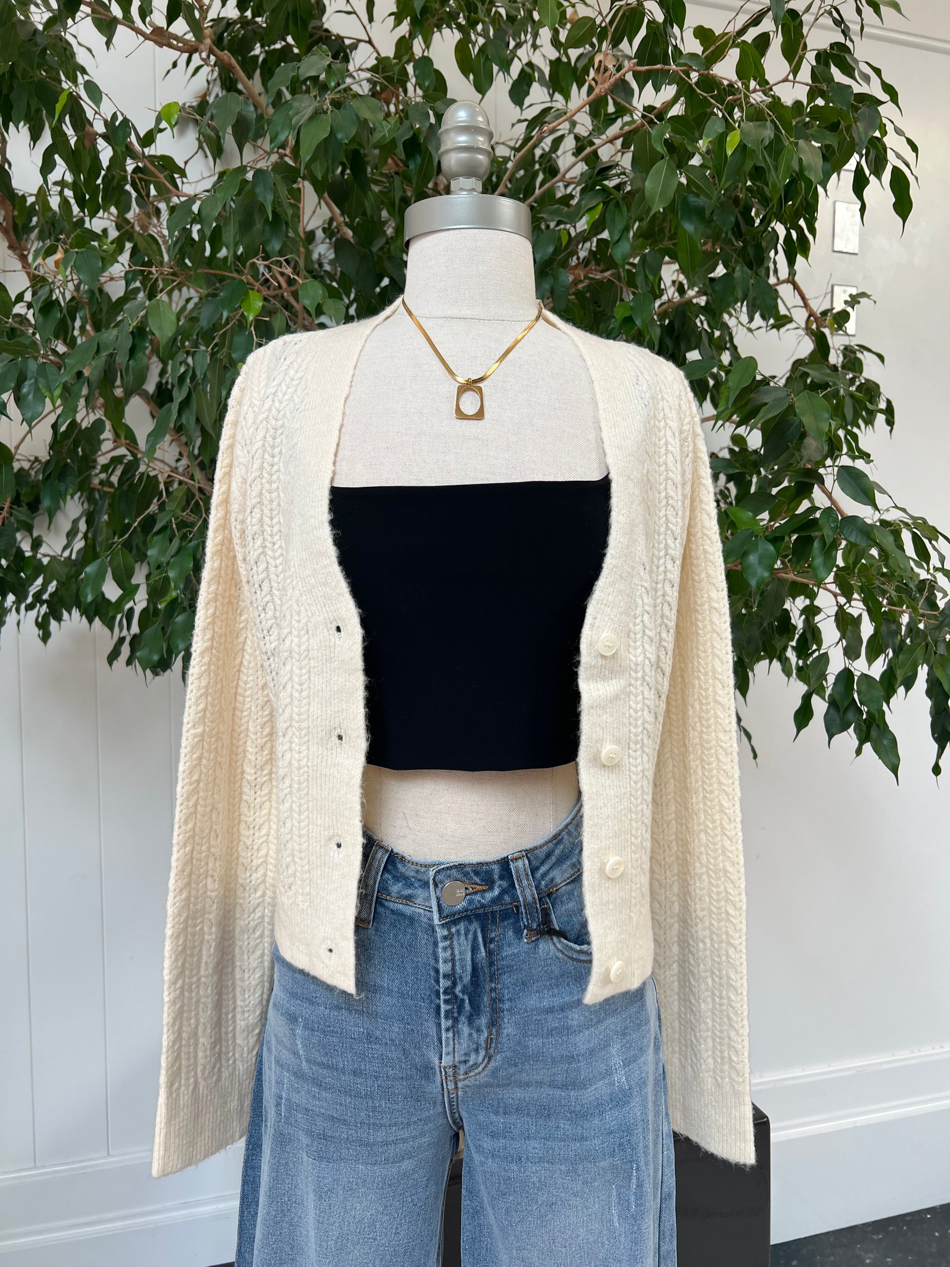 The Cozy & Sweet Cardigan is a must-have for any autumn wardrobe. With its cute and cozy knitting design, this cream-colored cardigan is perfect for snuggling up in cooler weather. Complete with functional buttons, it's the perfect piece to bring your outfit together and add a touch of warmth and style.