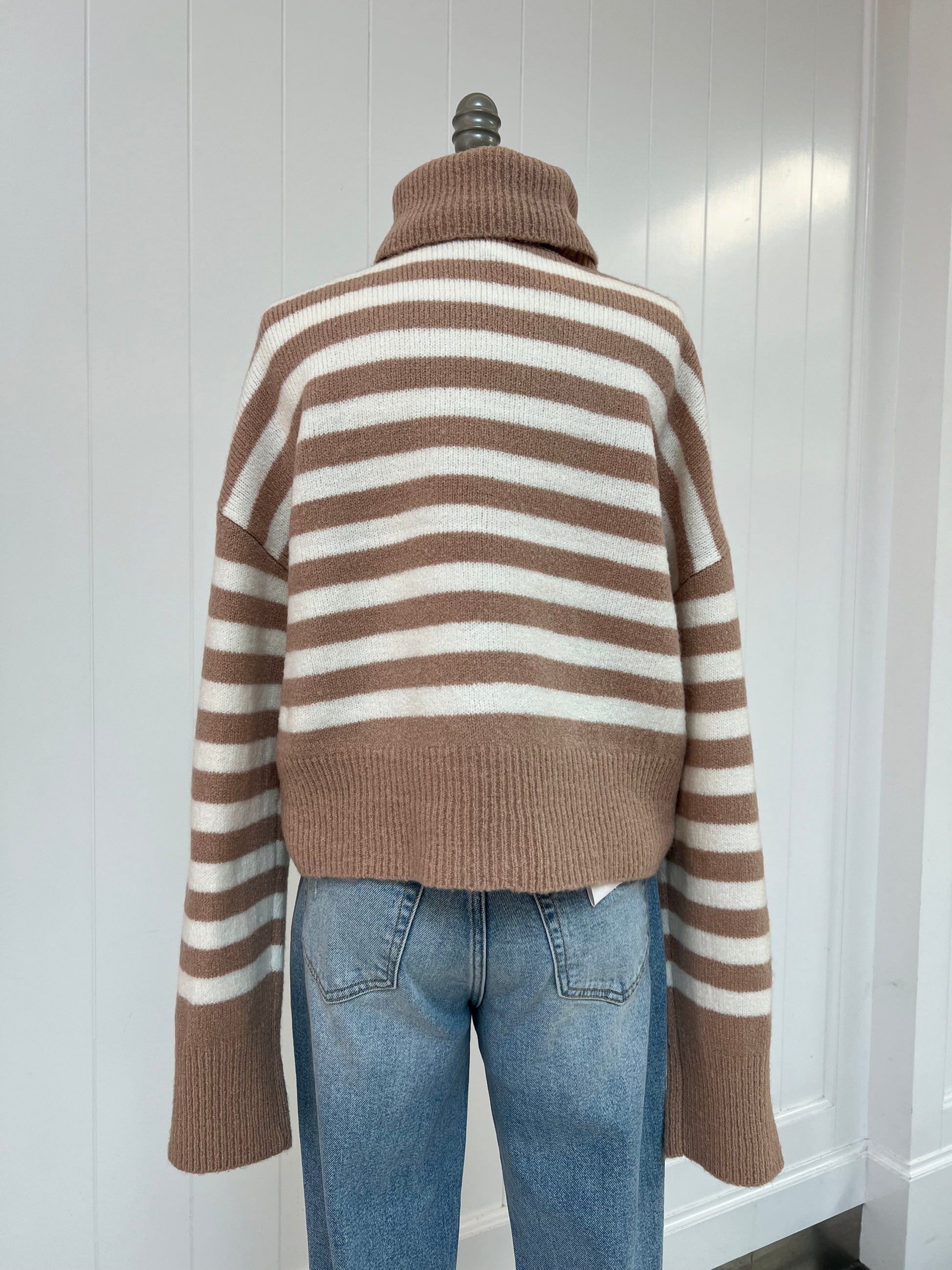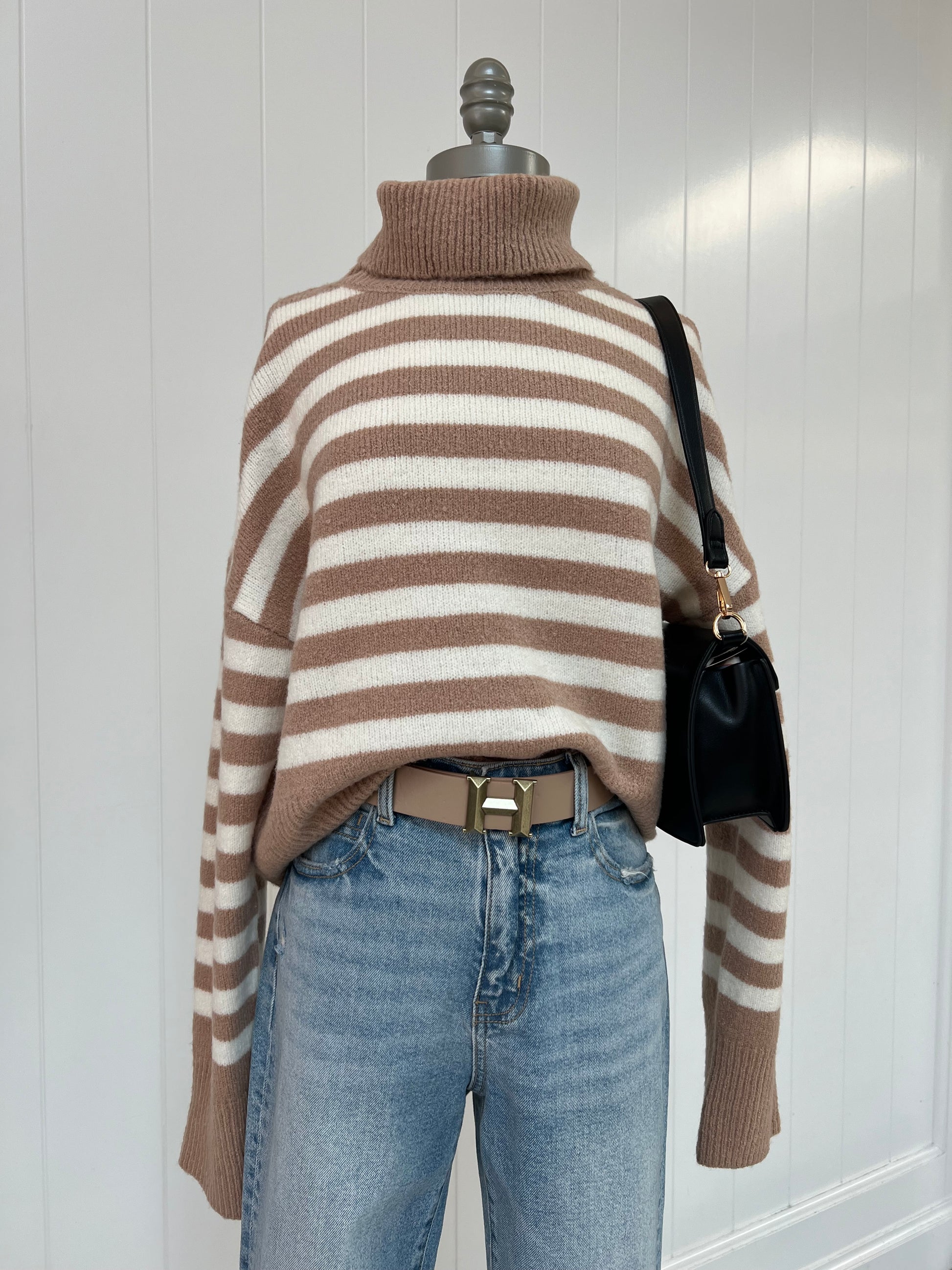Wrap yourself in the cozy comfort of our Fall In The Air Top. Crafted from a soft knitted fabric, this long sleeve turtle neck top is perfect for the upcoming season. Its oversized fit and stylish stripes make it the perfect pairing for your fall wardrobe, especially when styled with tights and boots. Don't miss out on adding this must-have top to your collection!