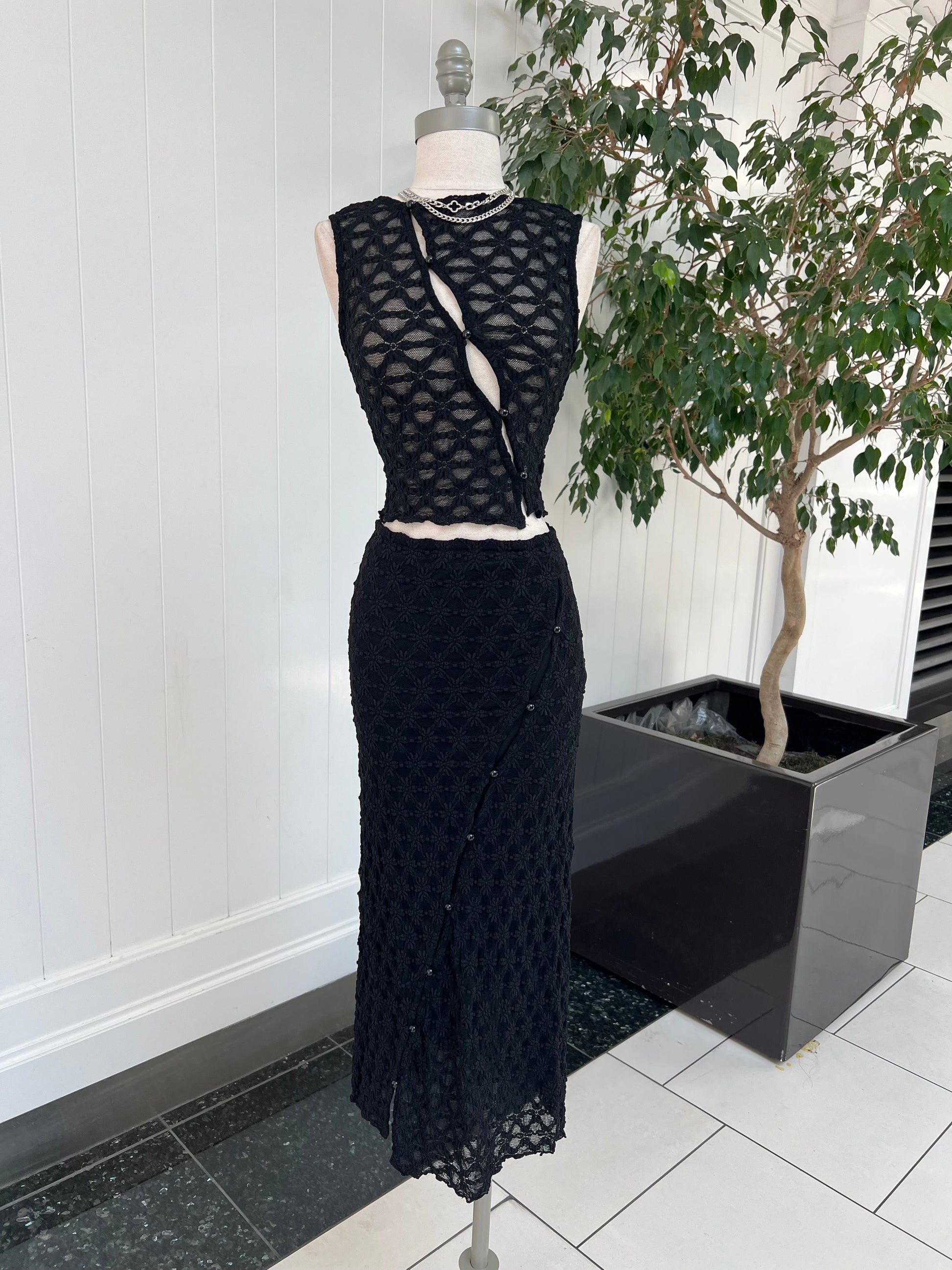 Be the star of the night with Impress The Night! This two piece skirt set features a delicate lace top with puff sleeves and floral prints, while the skirt is double lined for coverage. The cut button details add a touch of elegance, making it perfect for a sexy night out.