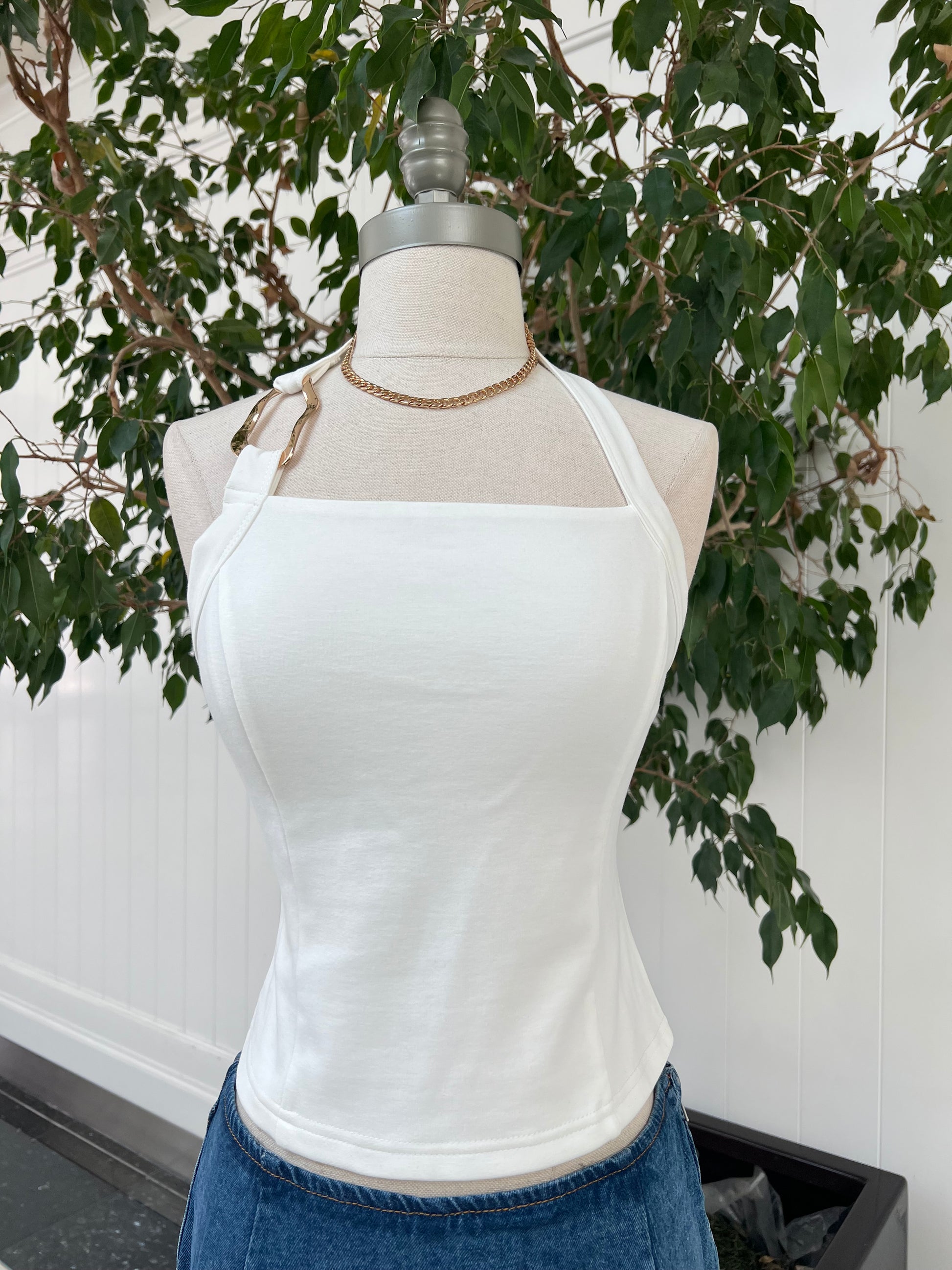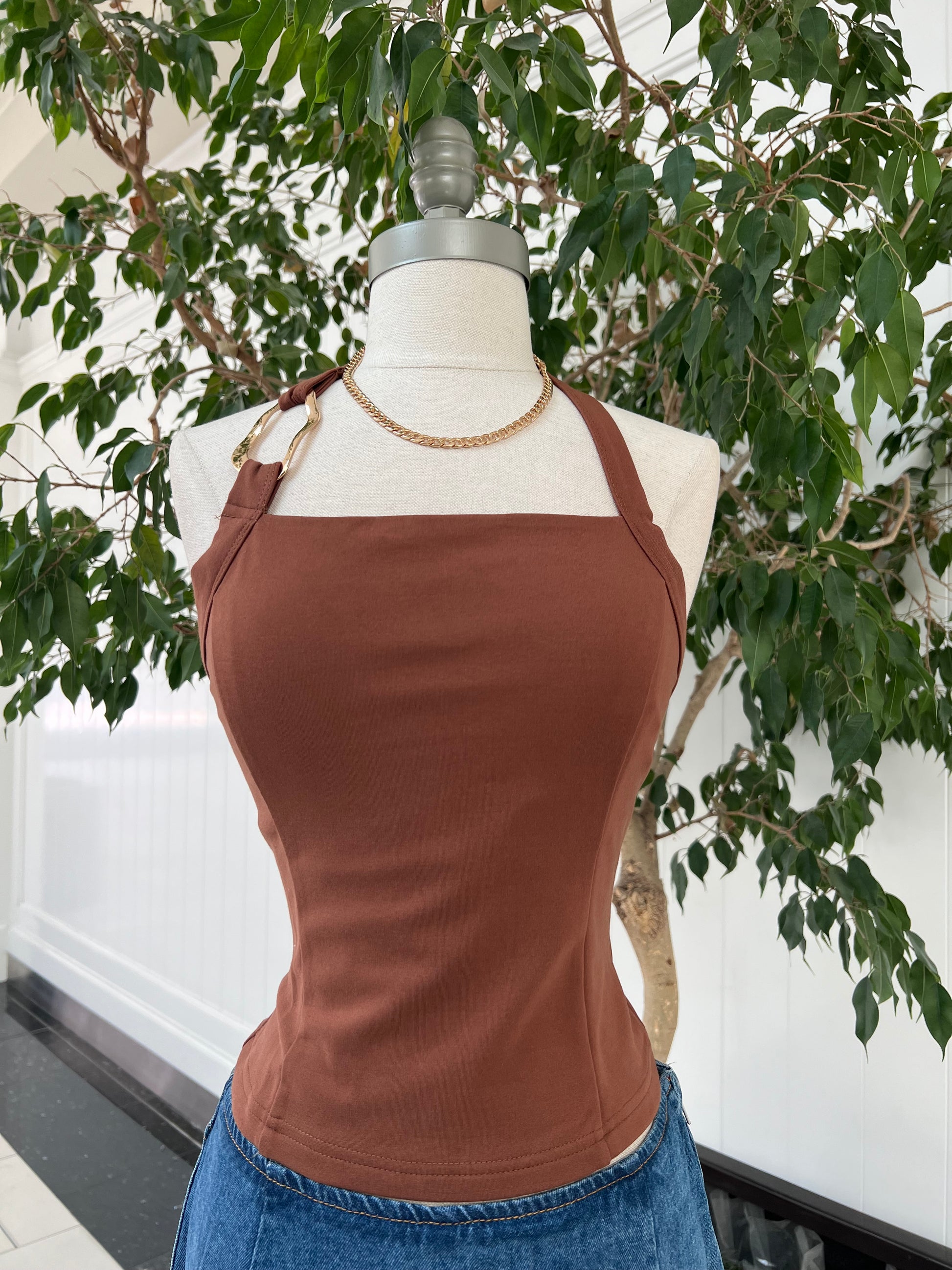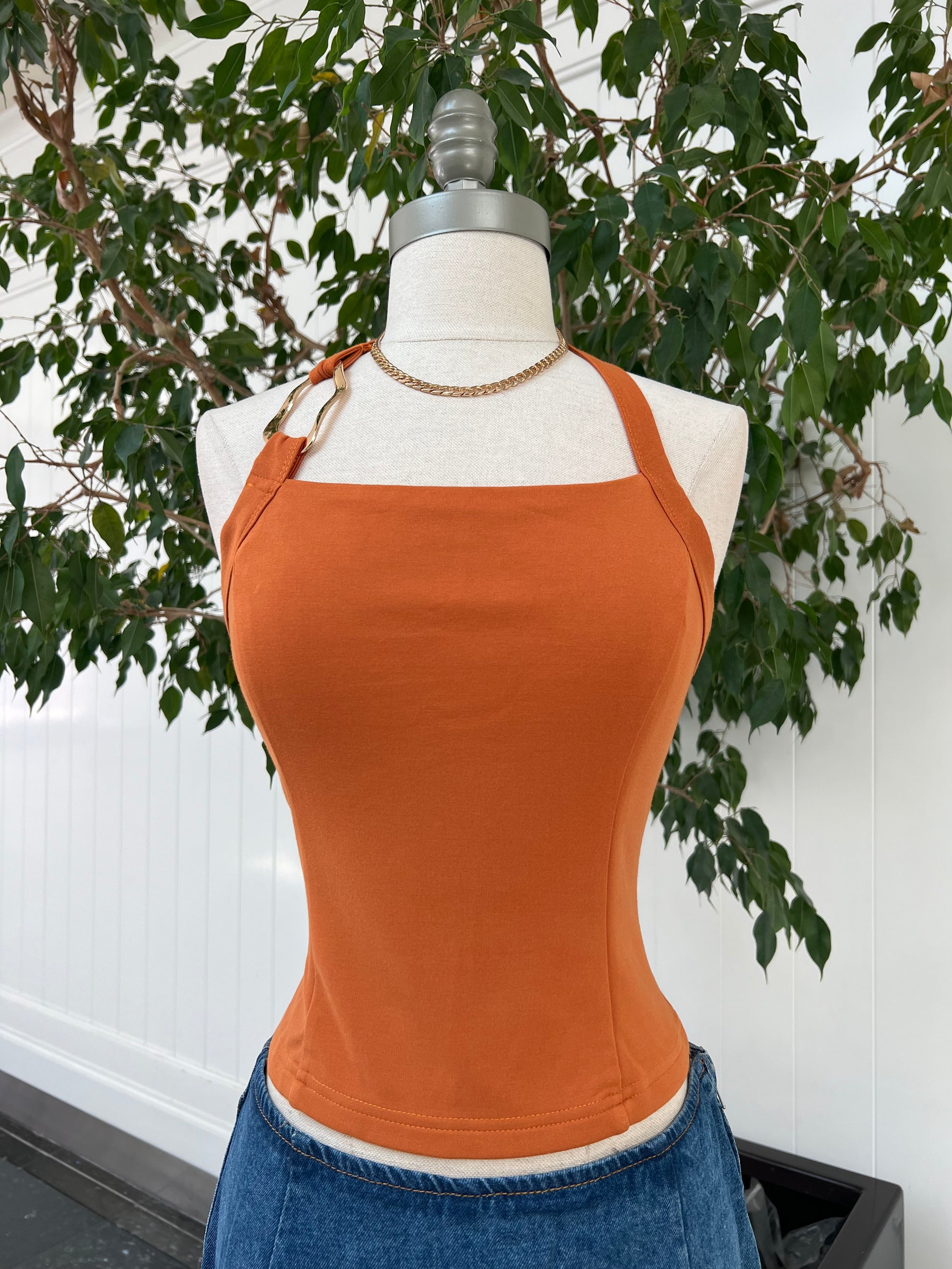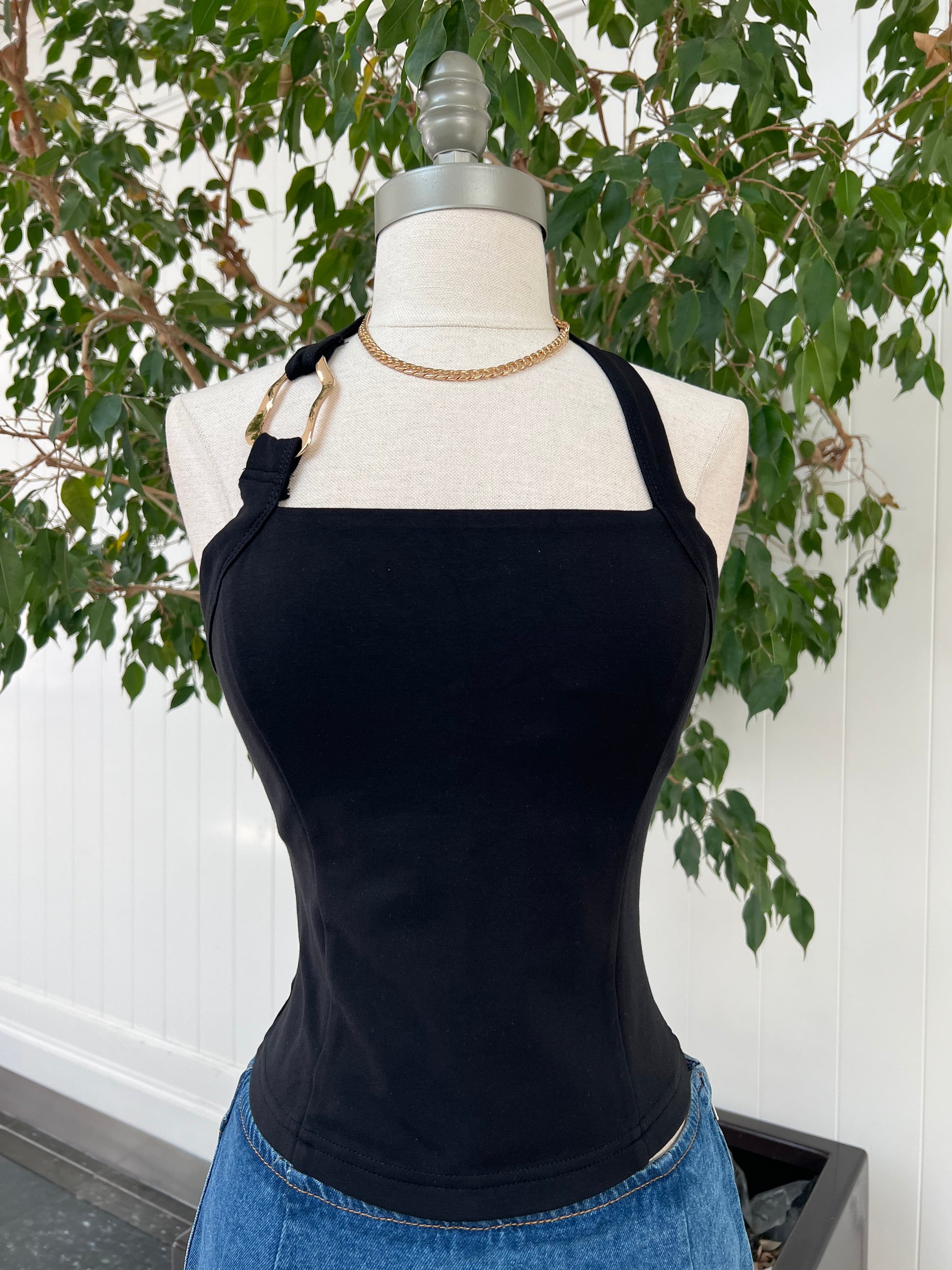 Achieve a stunning look with our Level You Up Top! This halter top features a ring jewel on the side strap for a cute and flashy touch. With its double lining and moderate stretch, it can be worn casually or dressed up for a classy look. The open back adds a touch of allure to any outfit. Upgrade your style now!