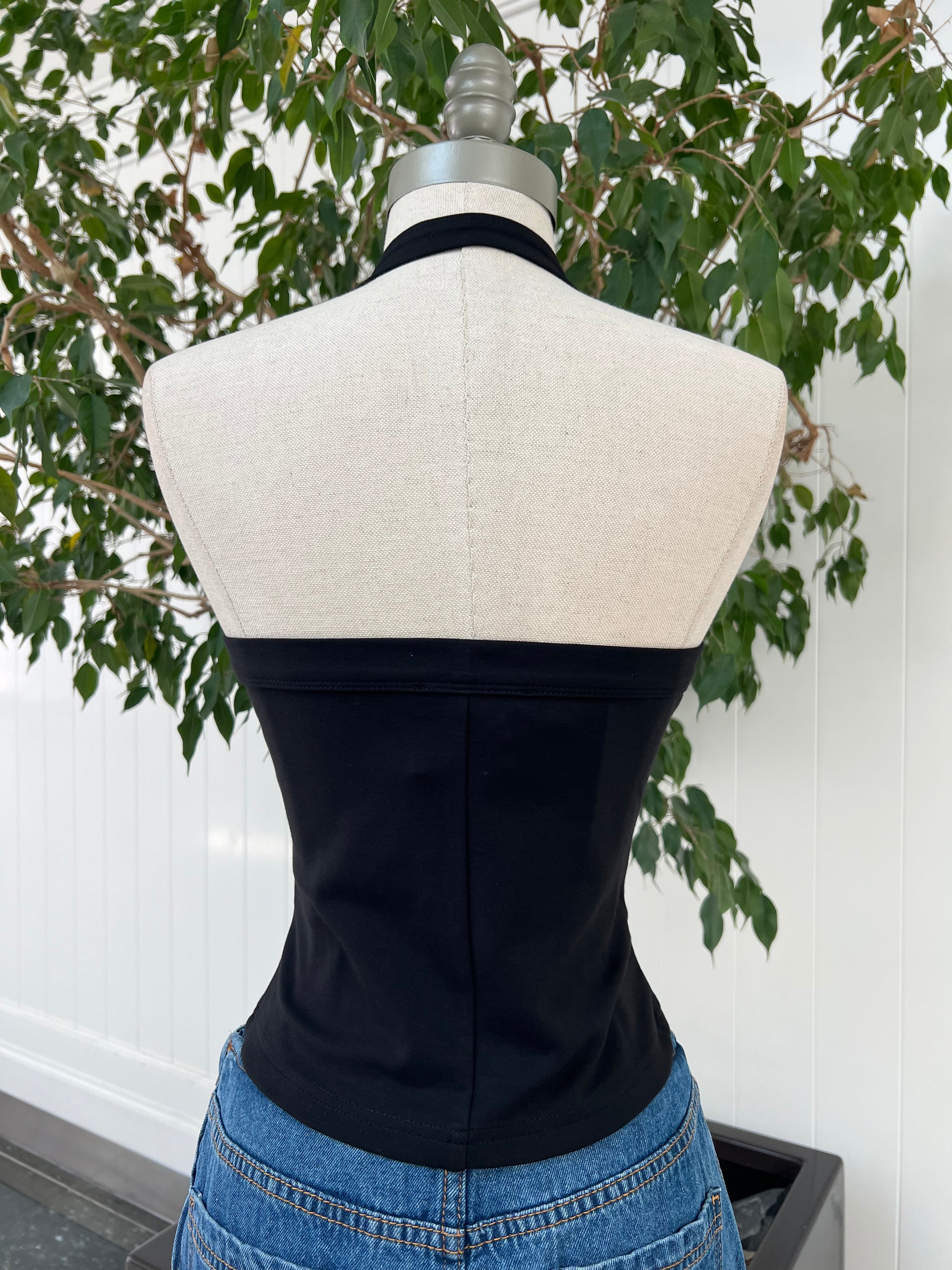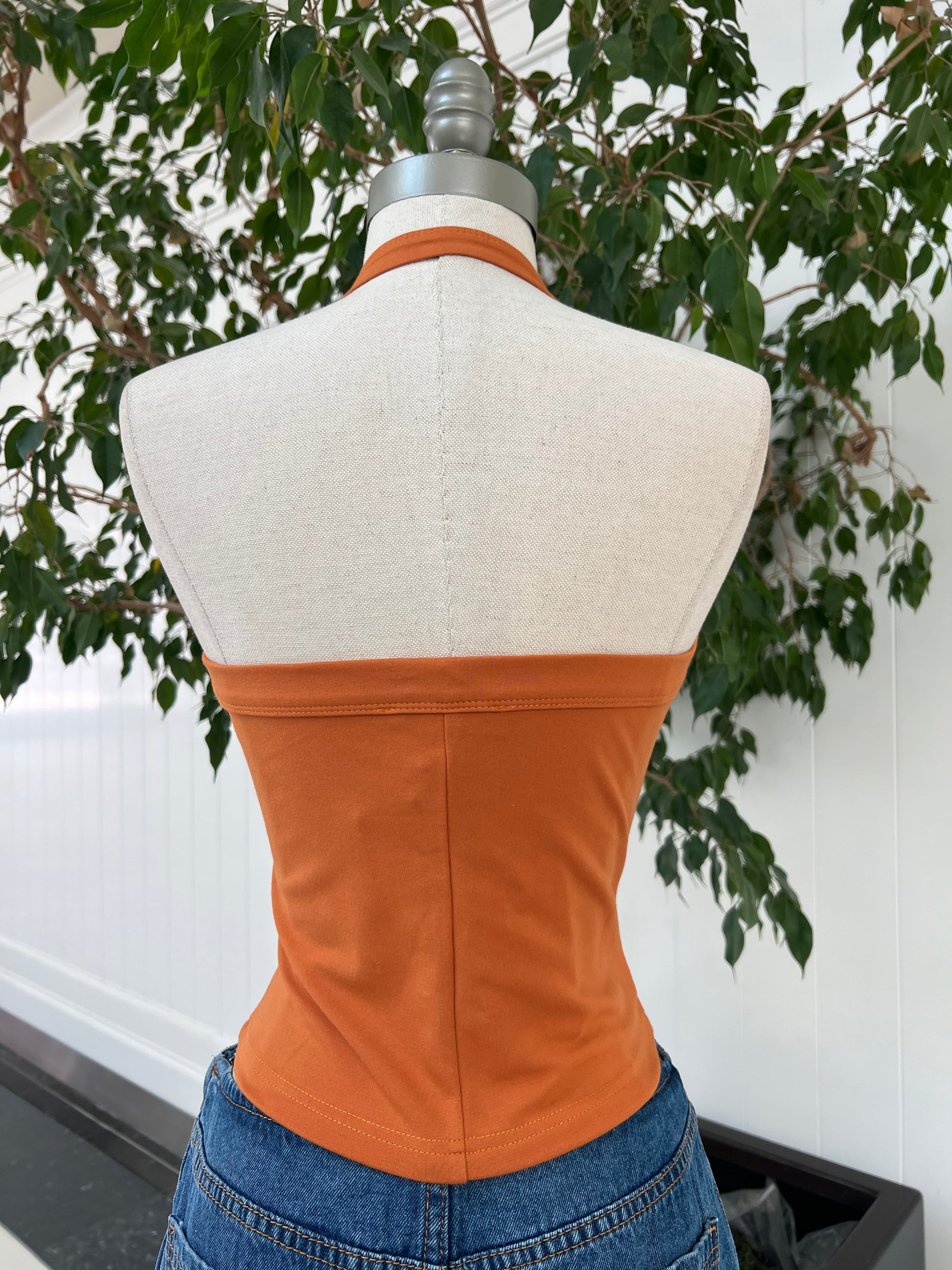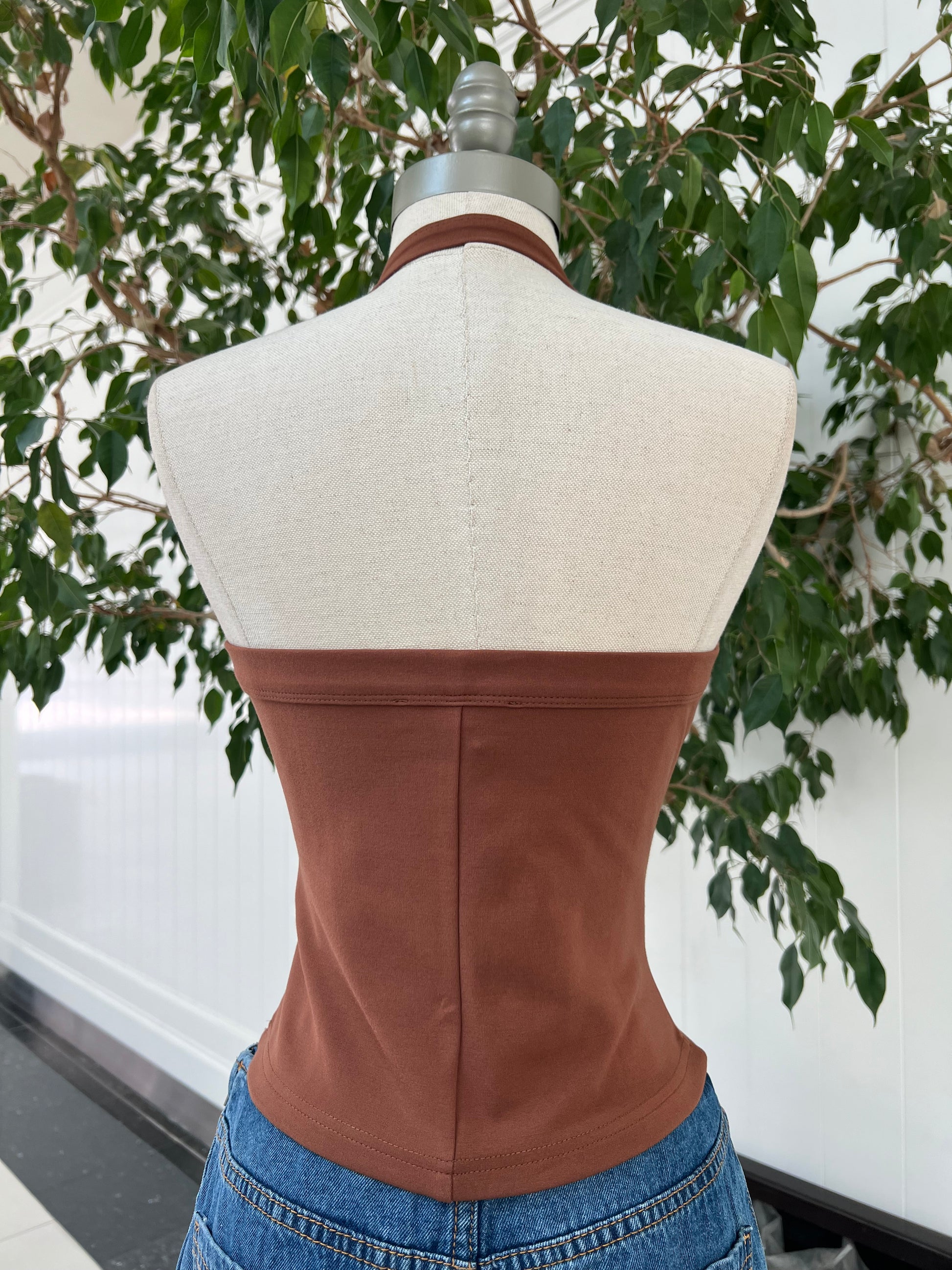 Achieve a stunning look with our Level You Up Top! This halter top features a ring jewel on the side strap for a cute and flashy touch. With its double lining and moderate stretch, it can be worn casually or dressed up for a classy look. The open back adds a touch of allure to any outfit. Upgrade your style now!
