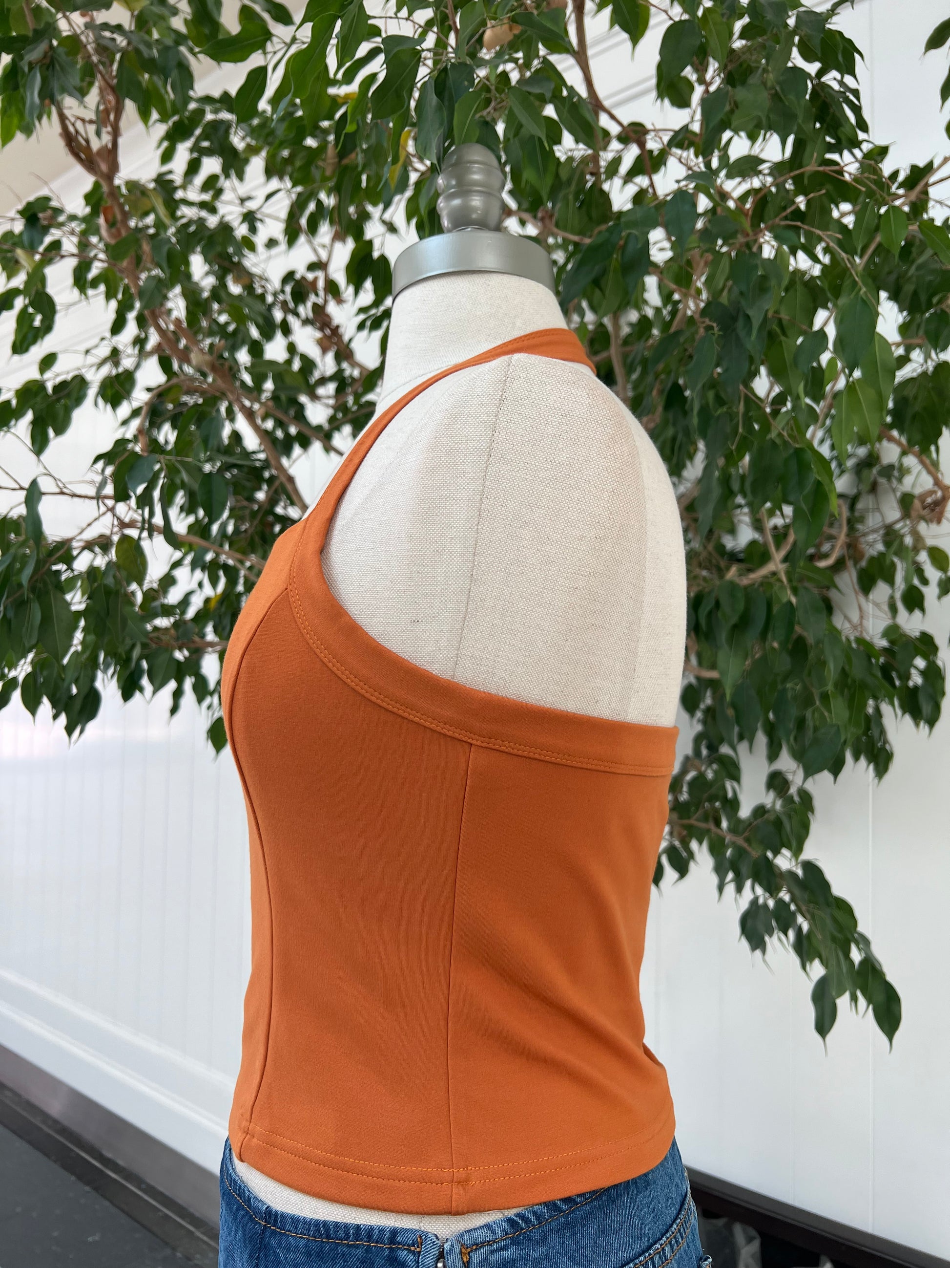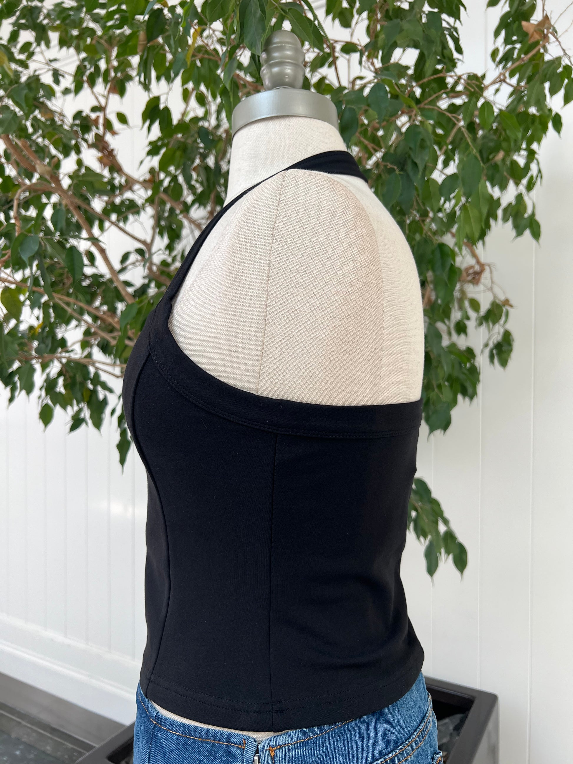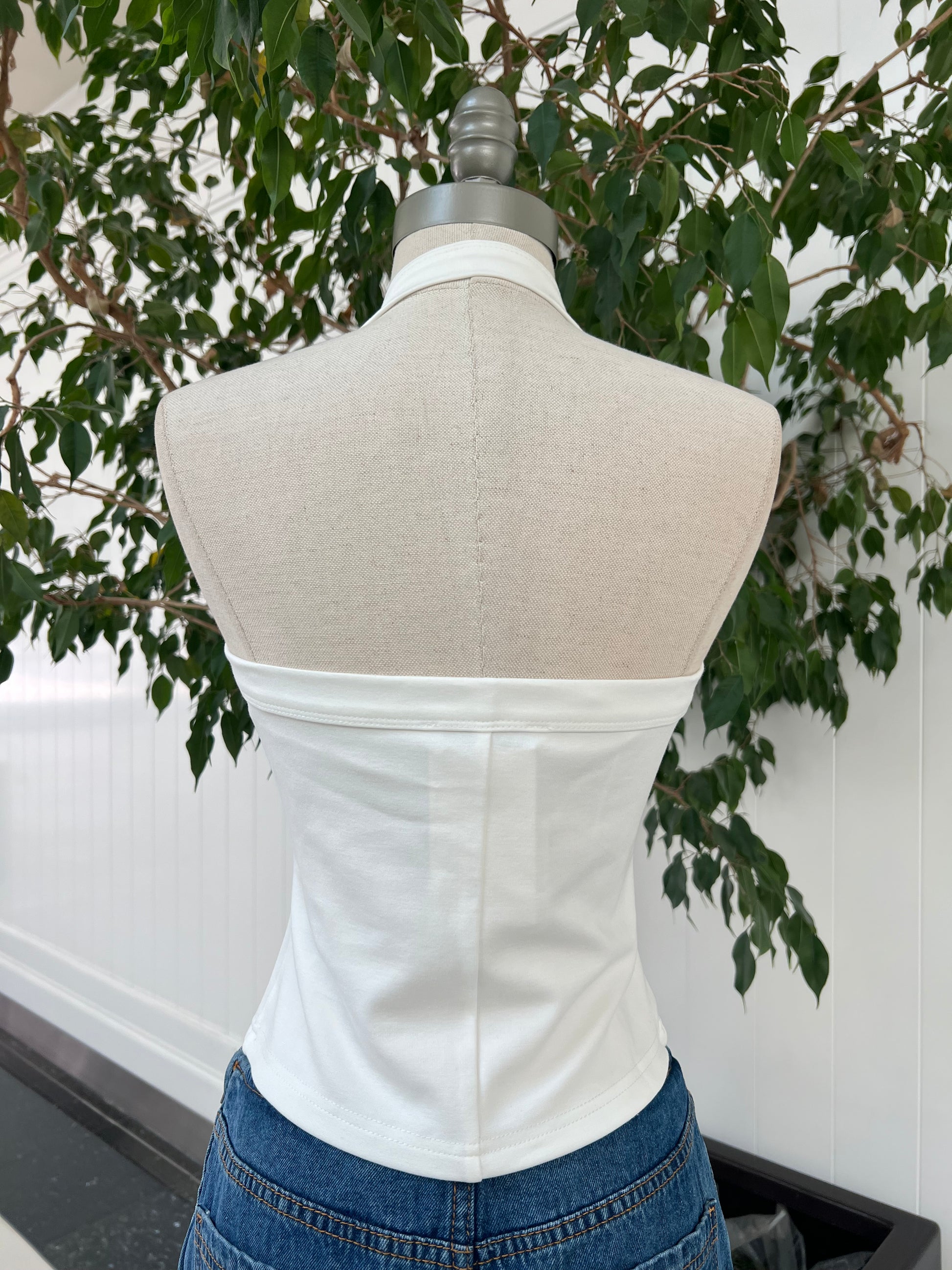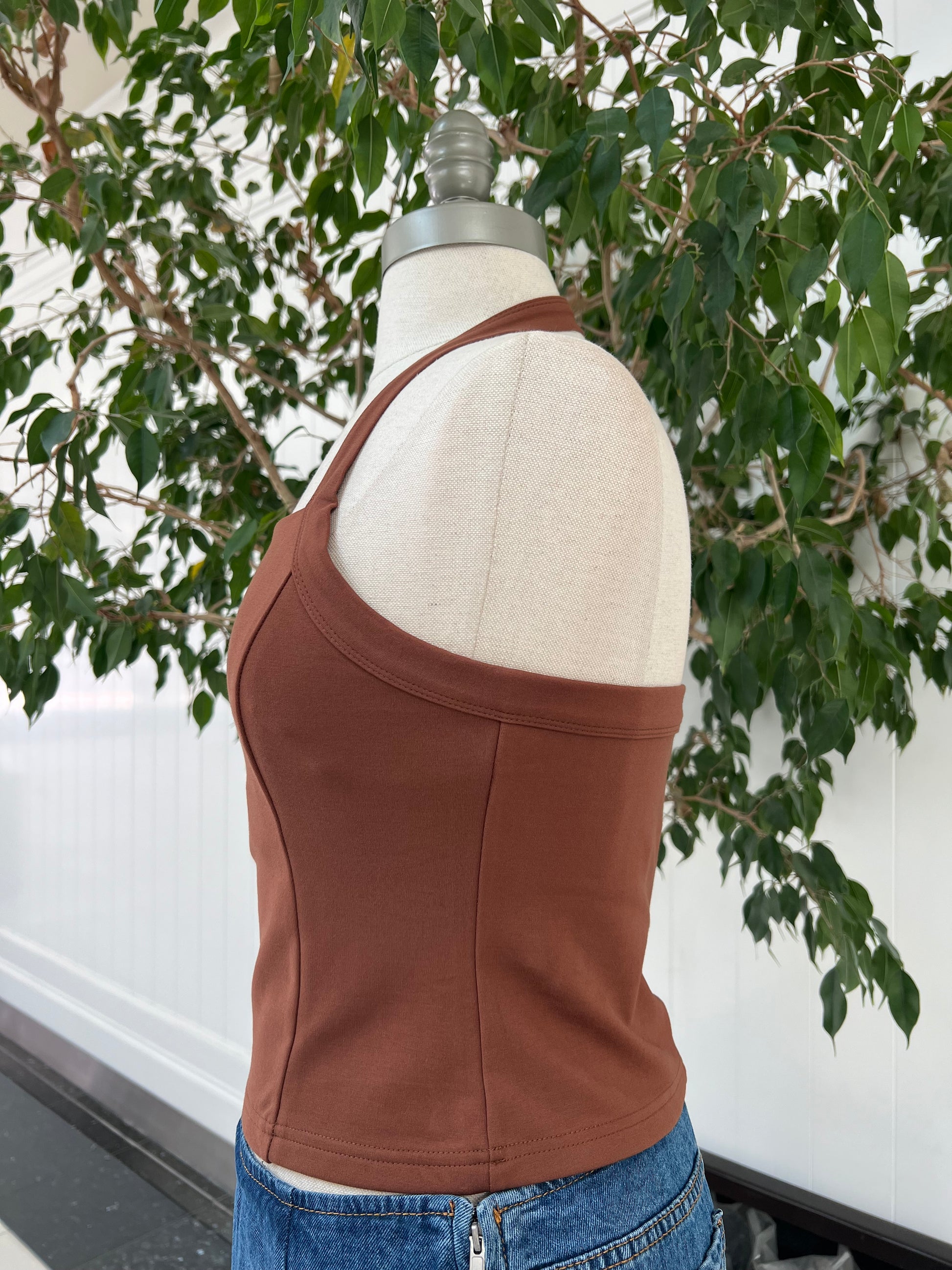 Achieve a stunning look with our Level You Up Top! This halter top features a ring jewel on the side strap for a cute and flashy touch. With its double lining and moderate stretch, it can be worn casually or dressed up for a classy look. The open back adds a touch of allure to any outfit. Upgrade your style now!