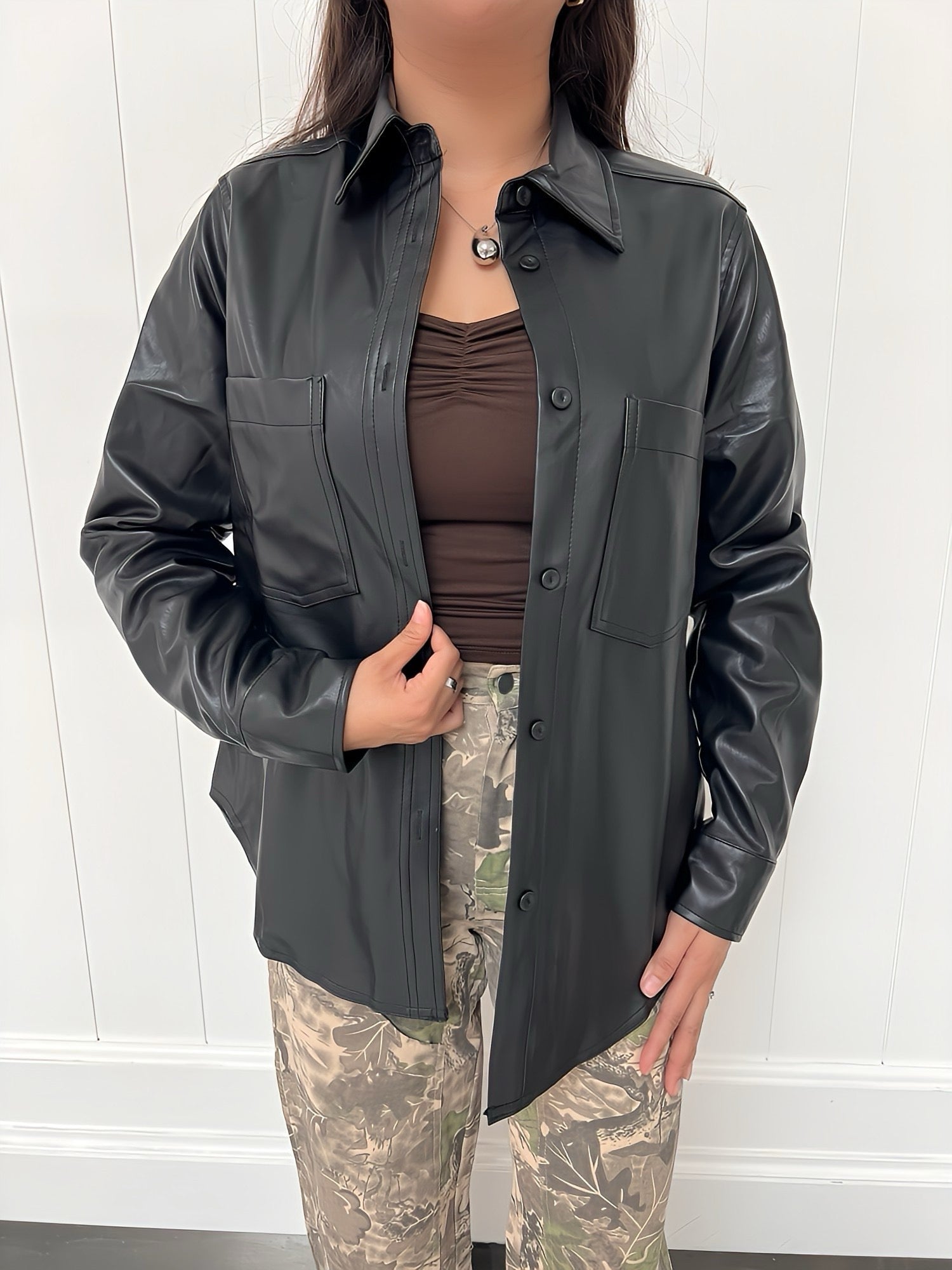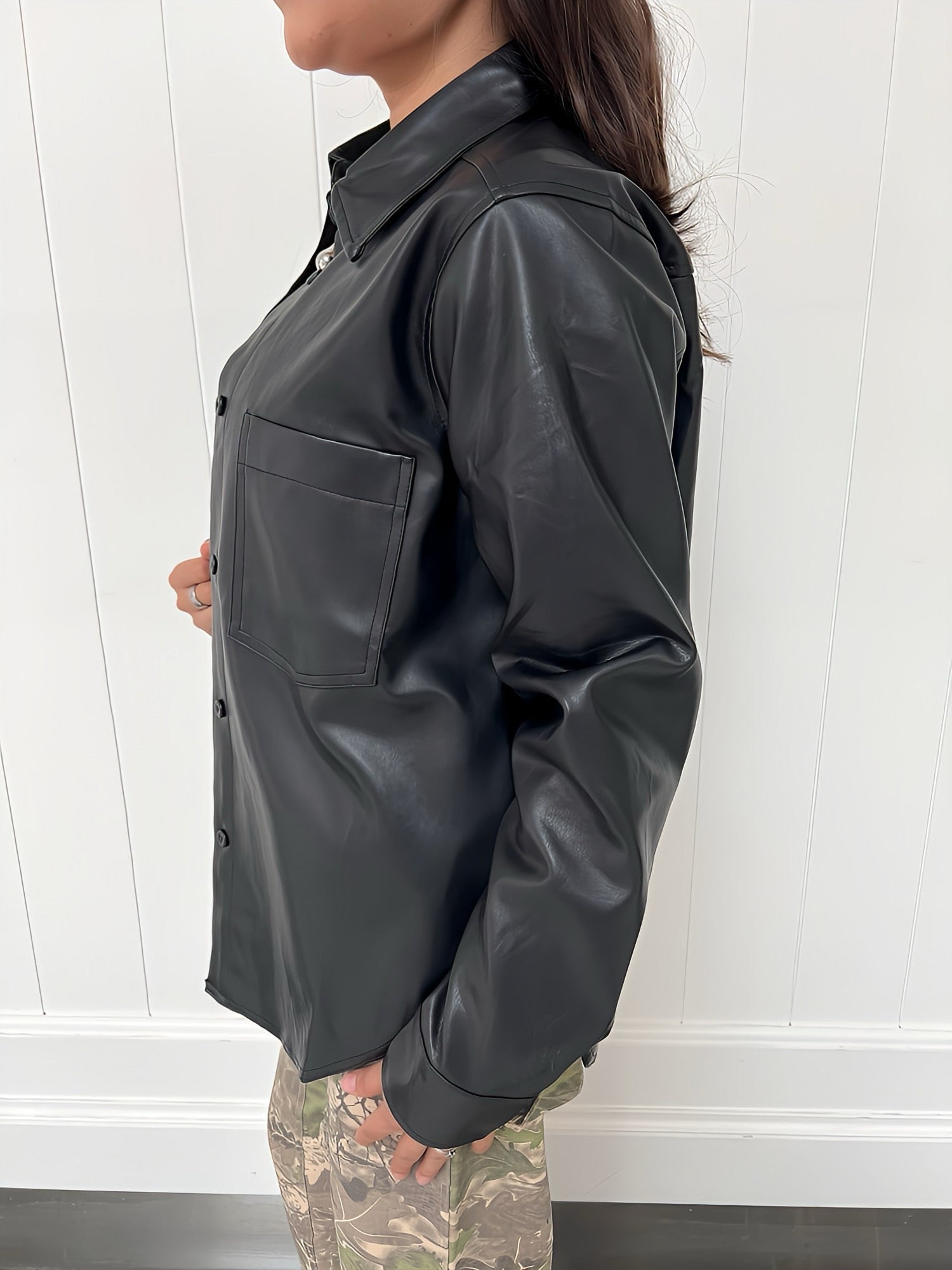 Introducing the New York Days Shacket, a chic fusion of a shirt and jacket that adds instant sophistication to any outfit. Available in sleek black and rich brown, this faux leather shacket is the ultimate layering piece for transitional seasons or when you need a touch of edgy elegance.