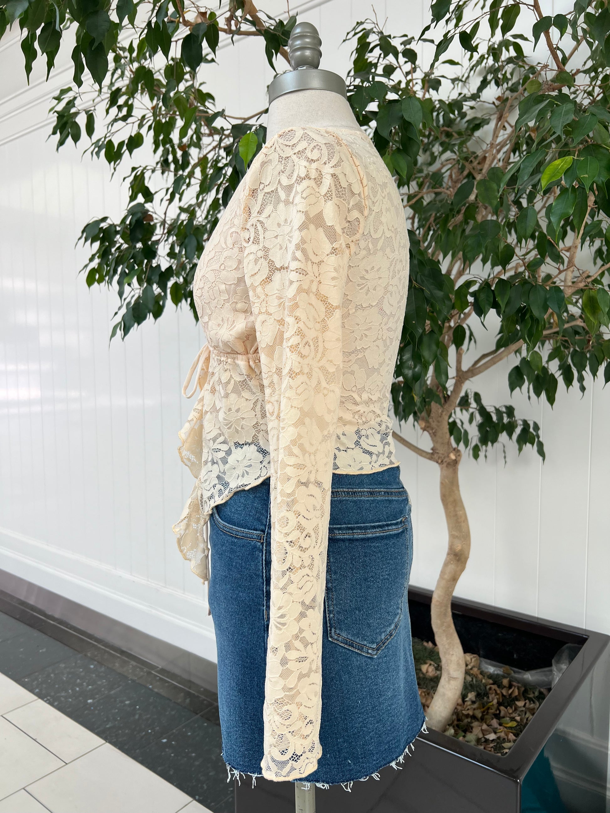 Elevate your evening look with our Perfect In Lace Top! This long sleeve top features a deep v neckline and a string tie for a customizable fit. The ruffle drape in the center adds a flirty touch while the lining behind the bust area provides coverage. The perfect choice for a night out!