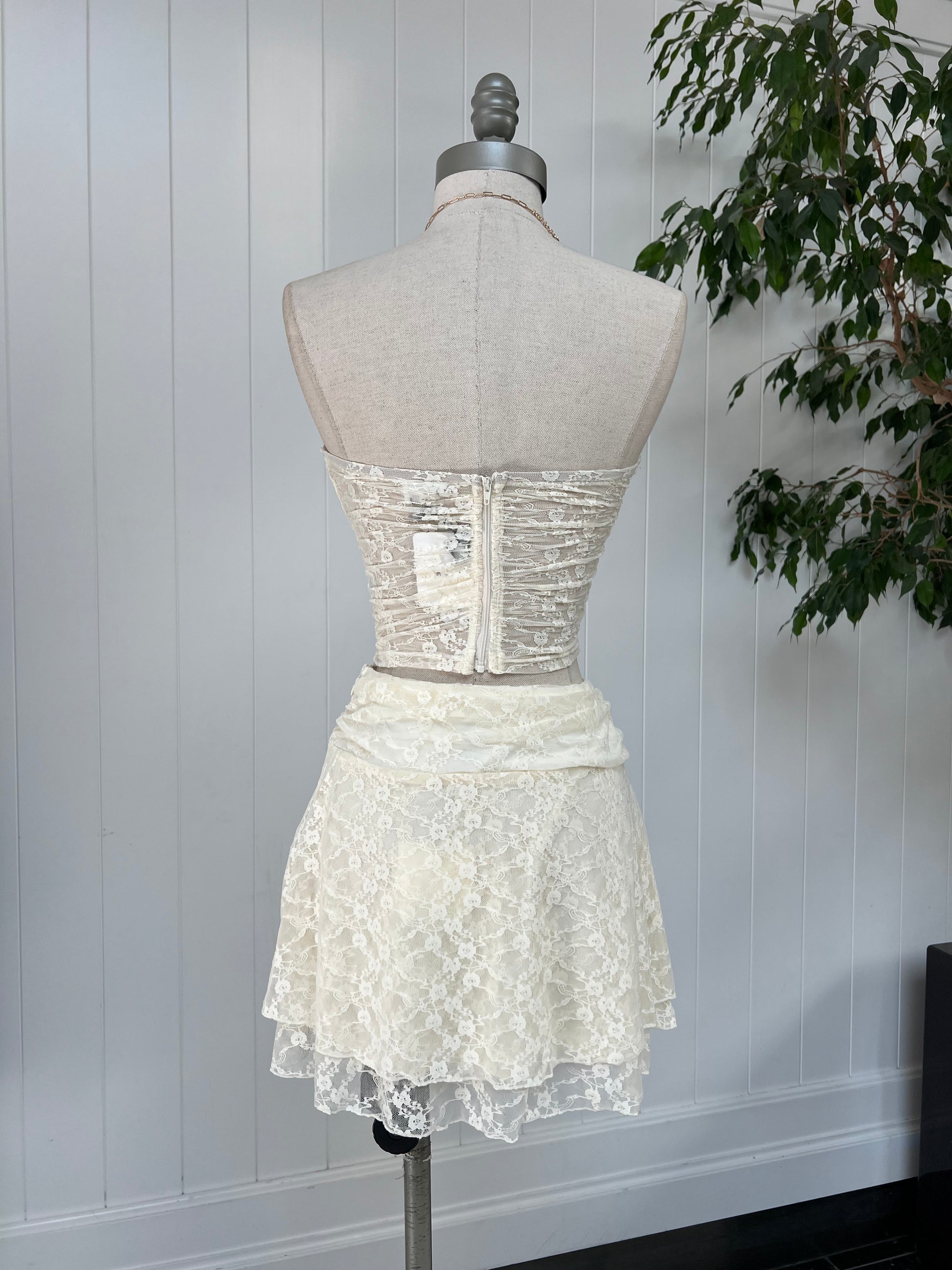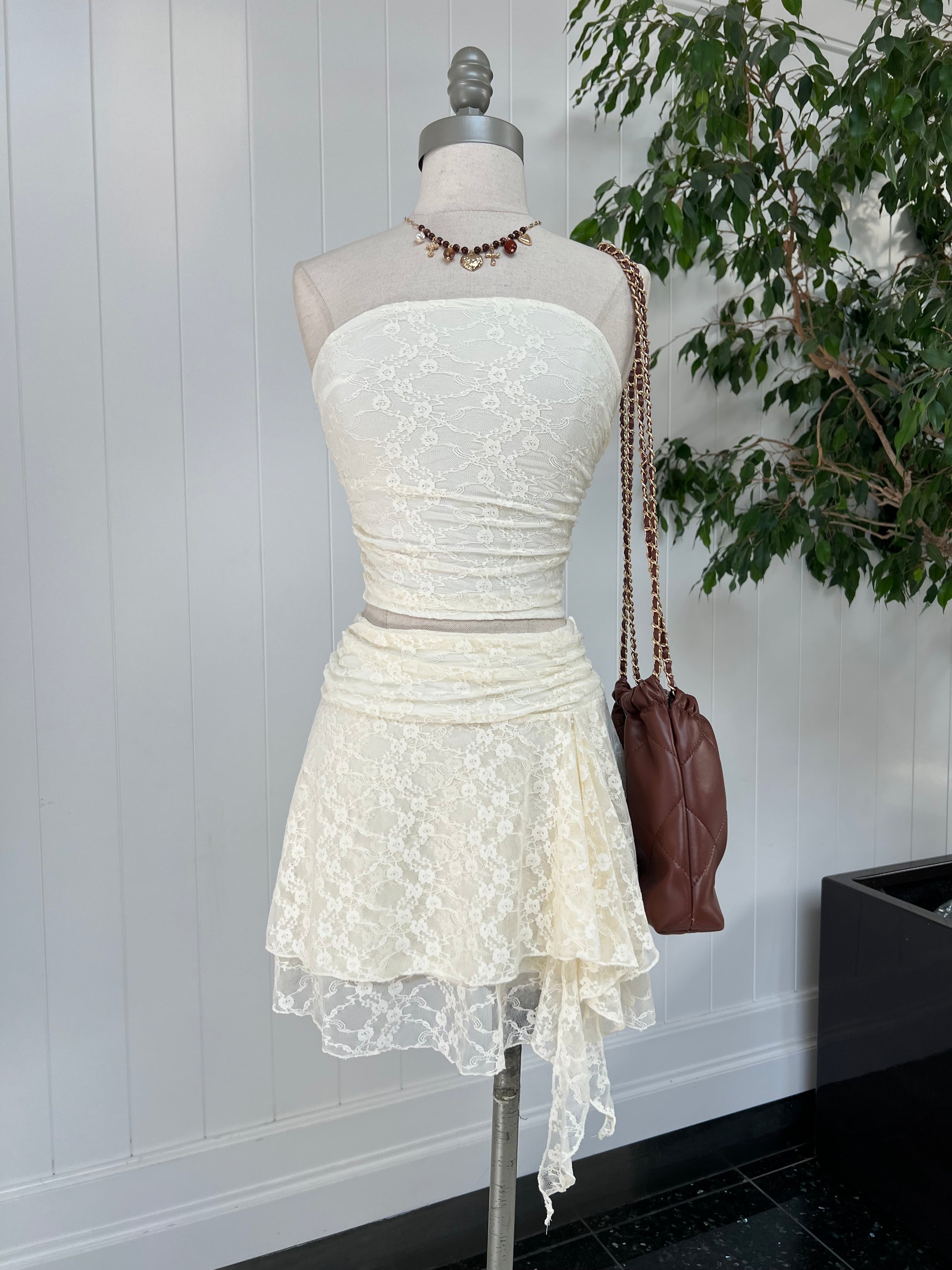 Make a statement in this elegant Romantic In Lace Set! The matching skirt set features a strapless top and a lace layered skirt with a draping lace detail on the side. With a double lined zipper and sew through on the back, it's the perfect piece to elevate your wardrobe.