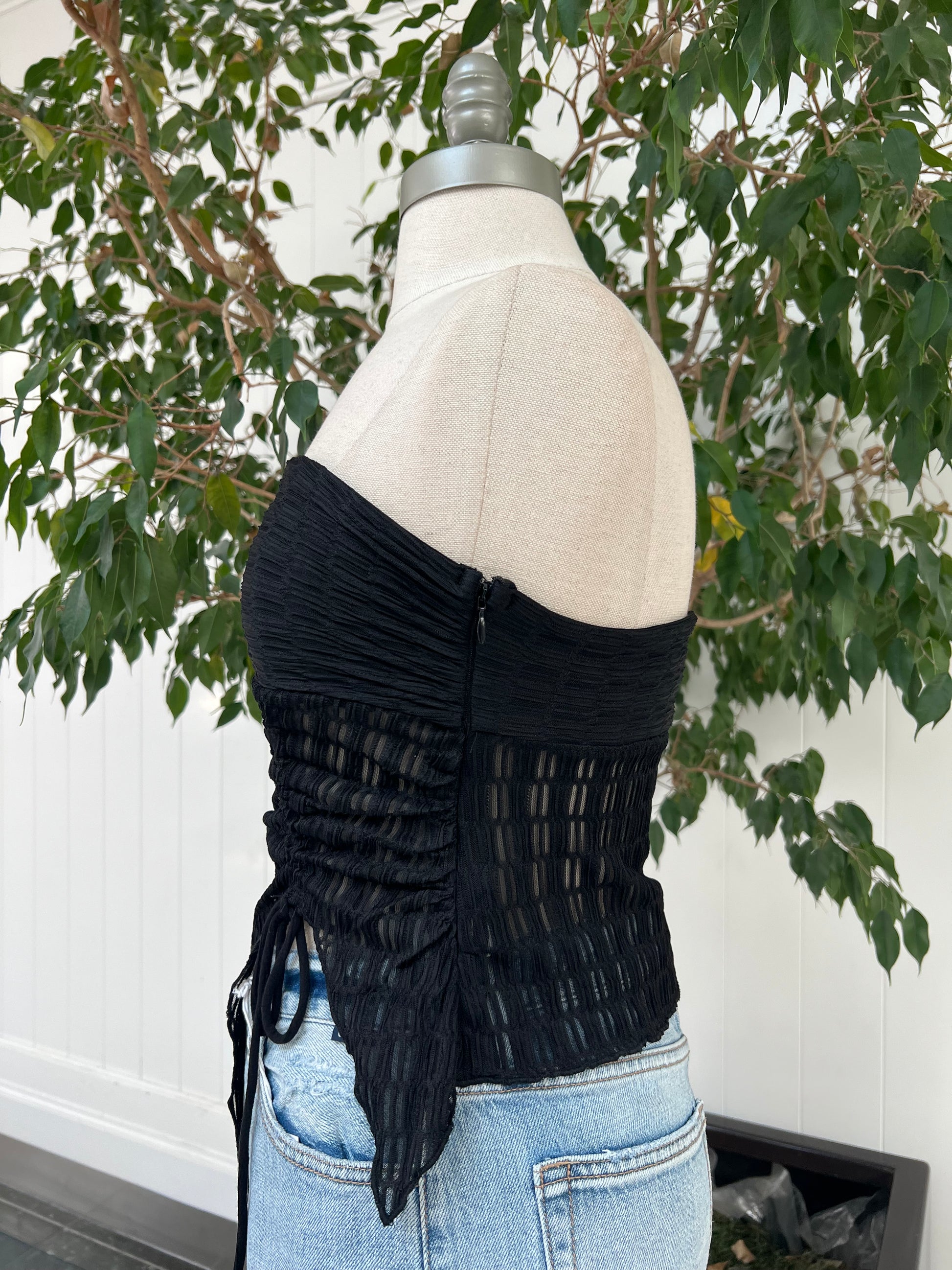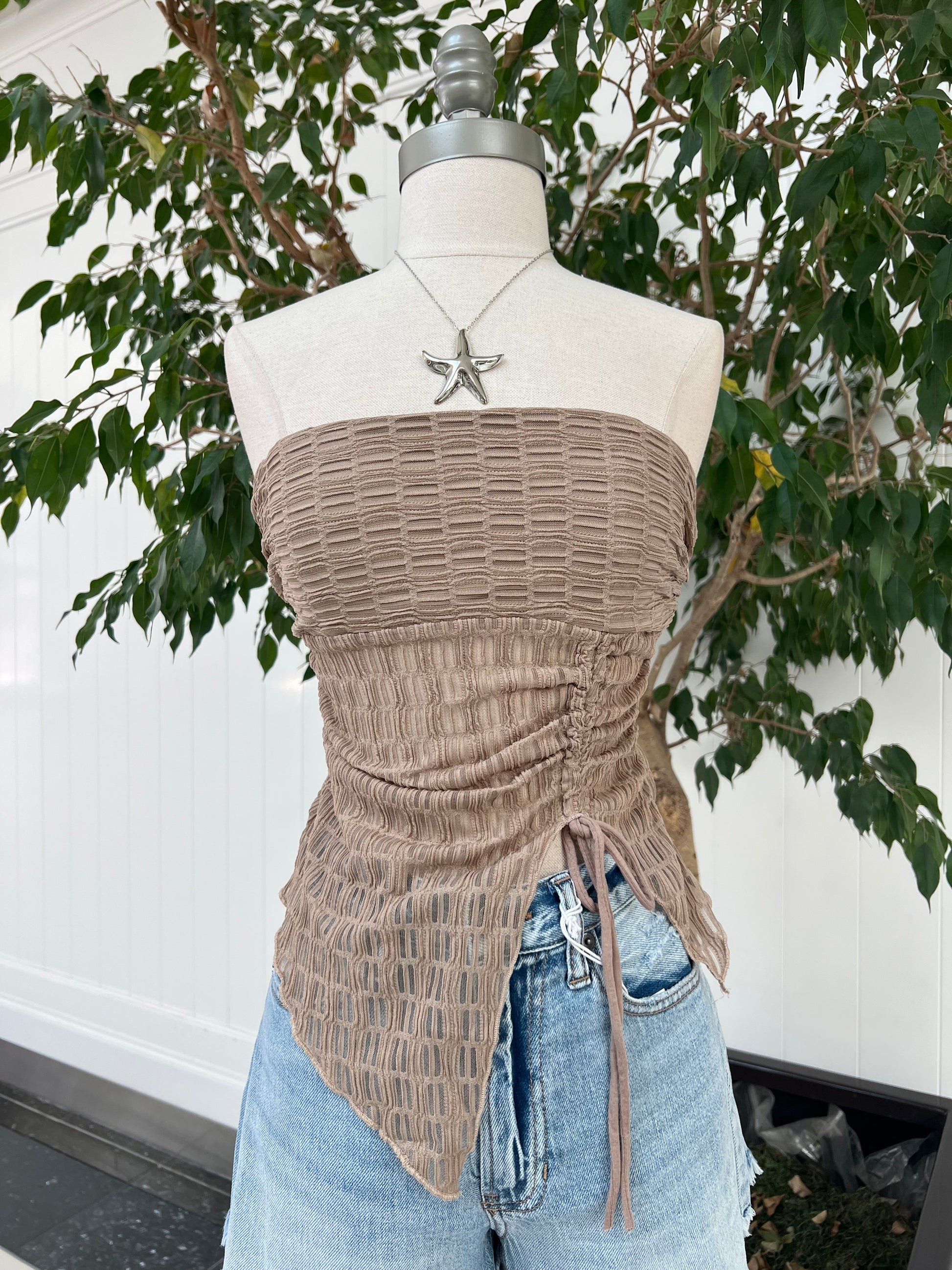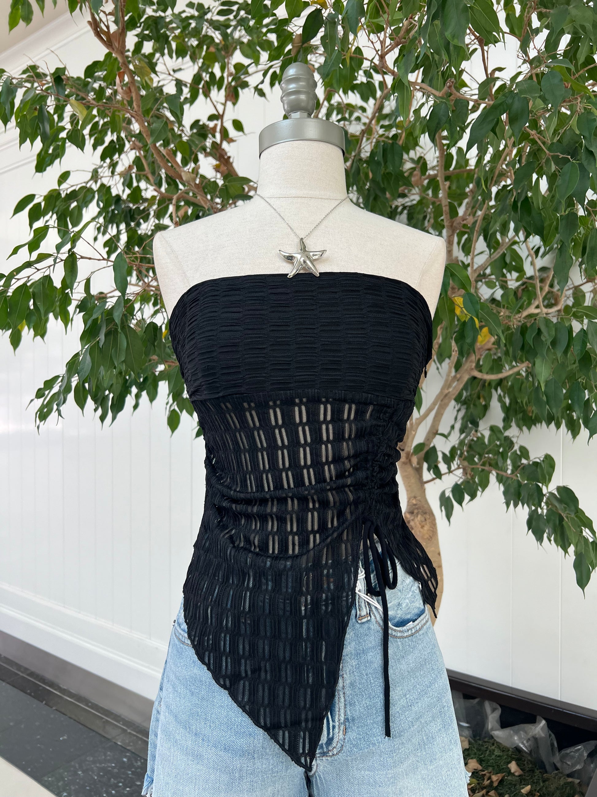 Looking for a top that seamlessly transitions from day to night? Look no further than our Summer Energy Top! This strapless top features an asymmetrical cut and an open slit for a flirty look. A zipper on the side allows for easy wear and the mesh material adds a touch of sexiness. The bust area has a layer for coverage while still maintaining a see-through effect. The scrunch stitching ties it all together, making it perfect for any occasion - whether it's a casual day or a day at the beach!