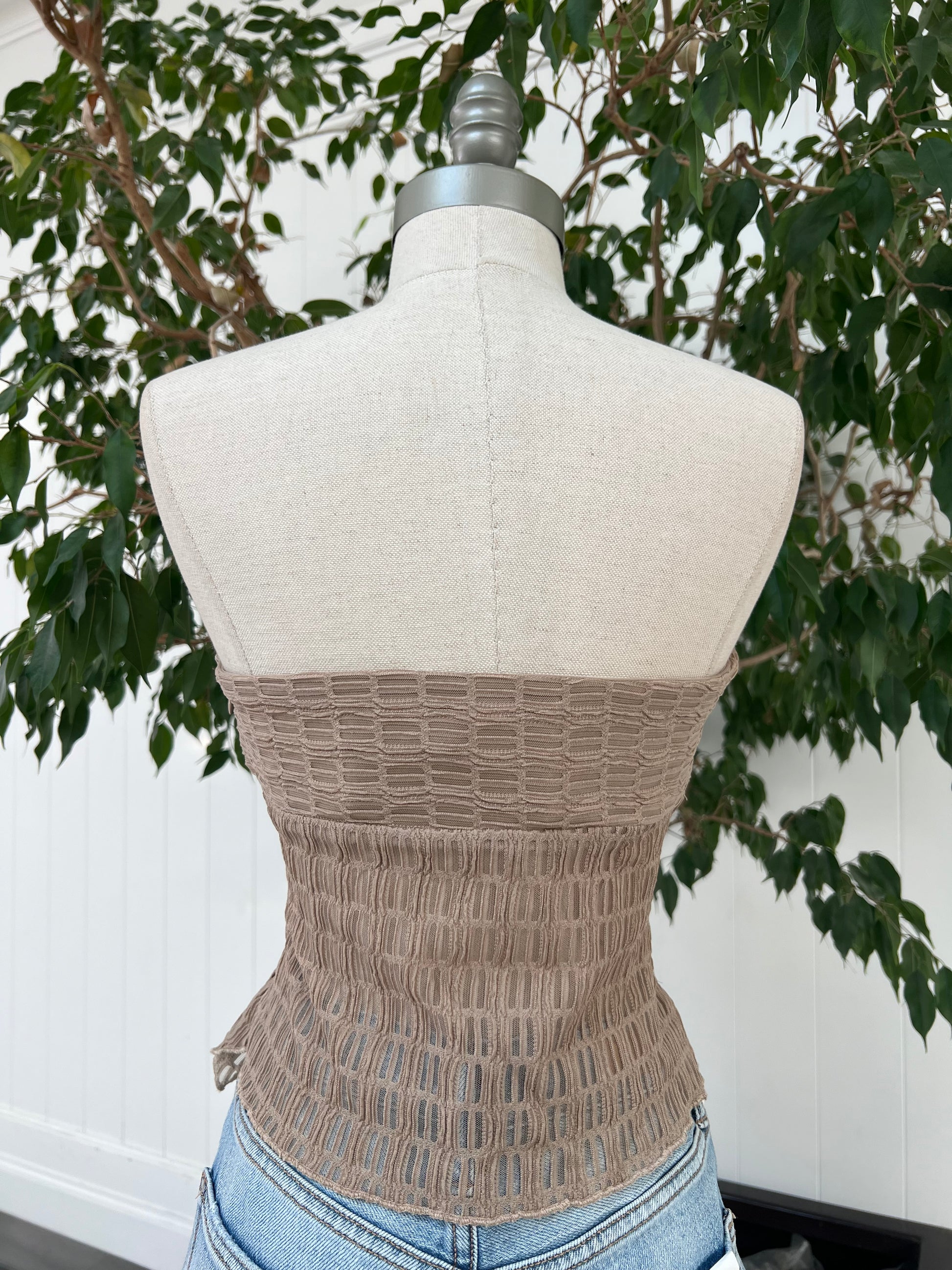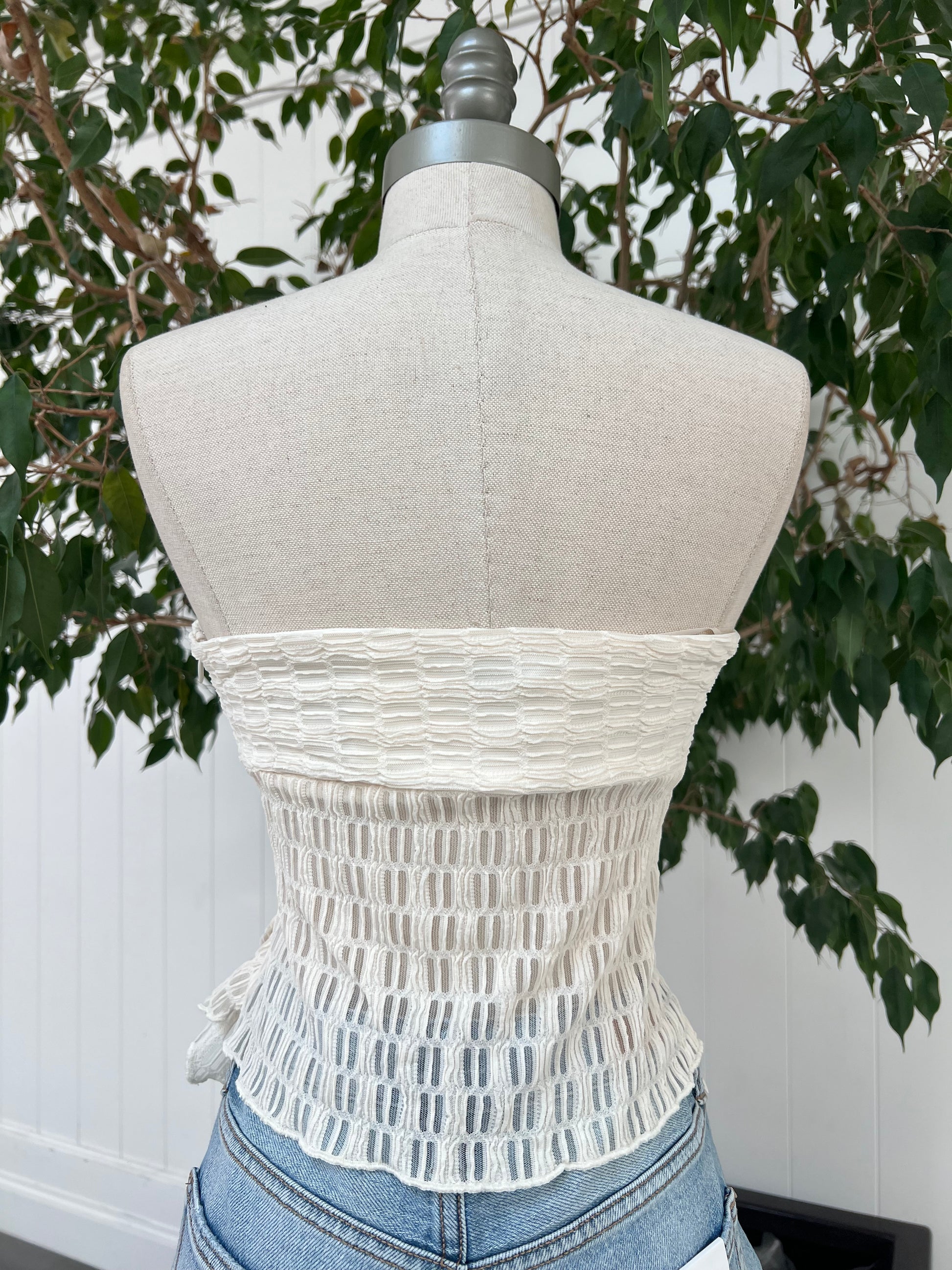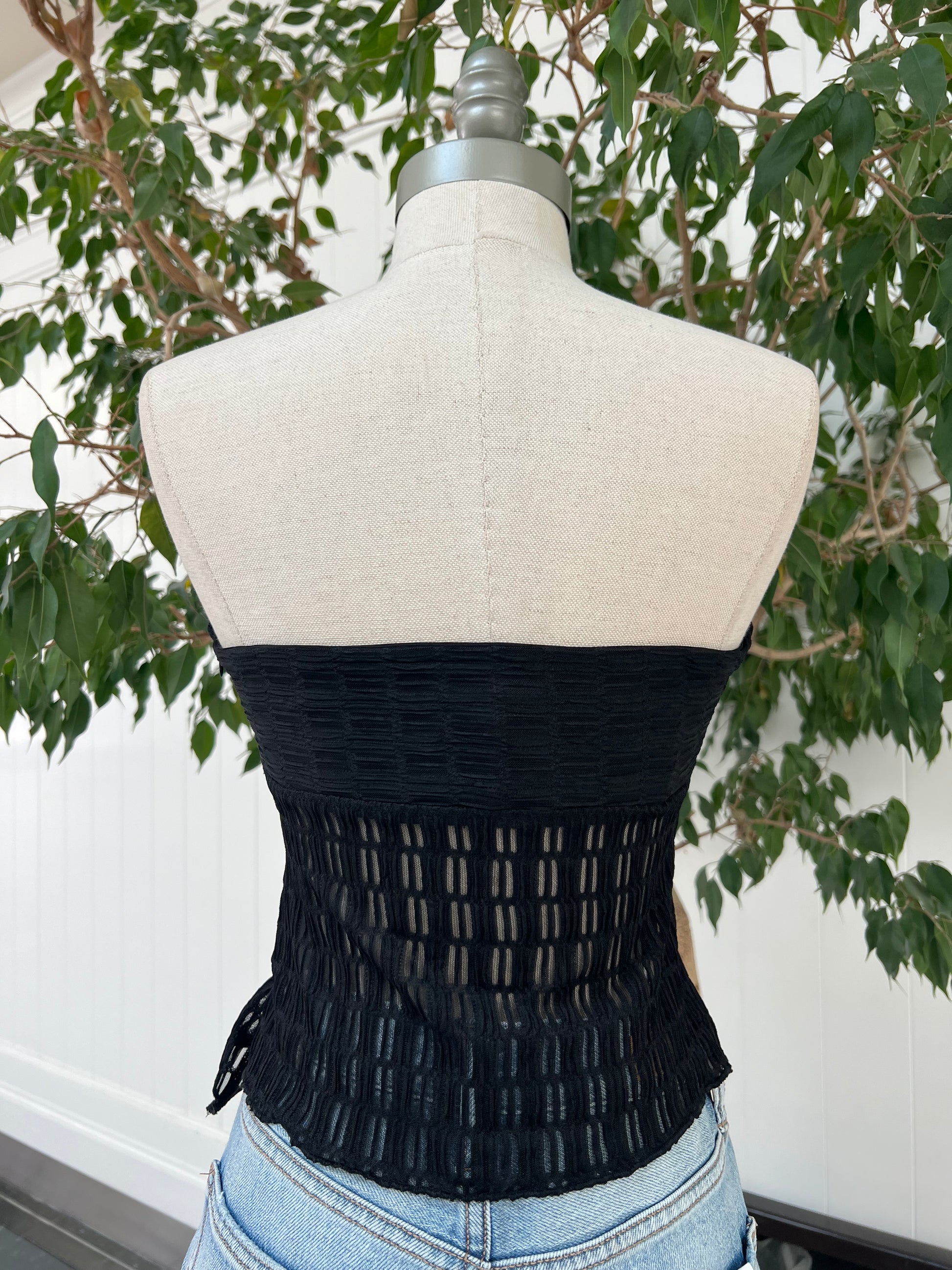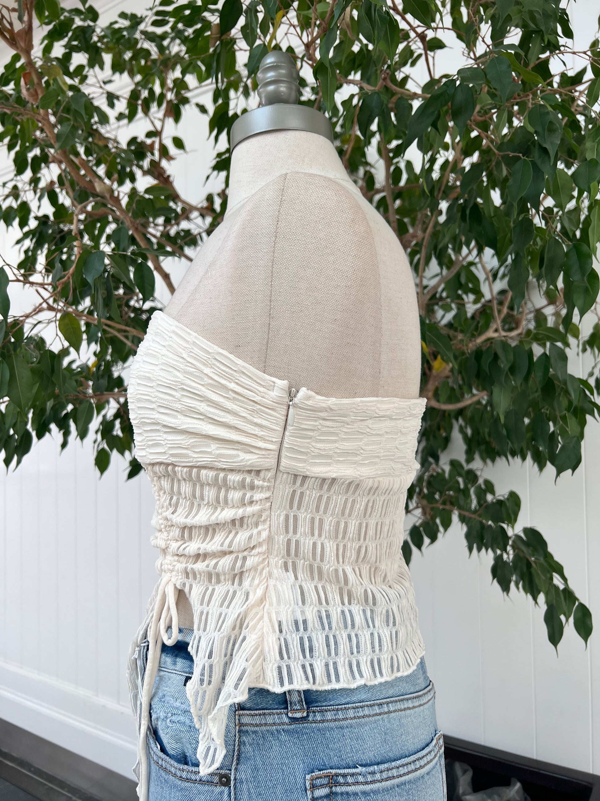Looking for a top that seamlessly transitions from day to night? Look no further than our Summer Energy Top! This strapless top features an asymmetrical cut and an open slit for a flirty look. A zipper on the side allows for easy wear and the mesh material adds a touch of sexiness. The bust area has a layer for coverage while still maintaining a see-through effect. The scrunch stitching ties it all together, making it perfect for any occasion - whether it's a casual day or a day at the beach!