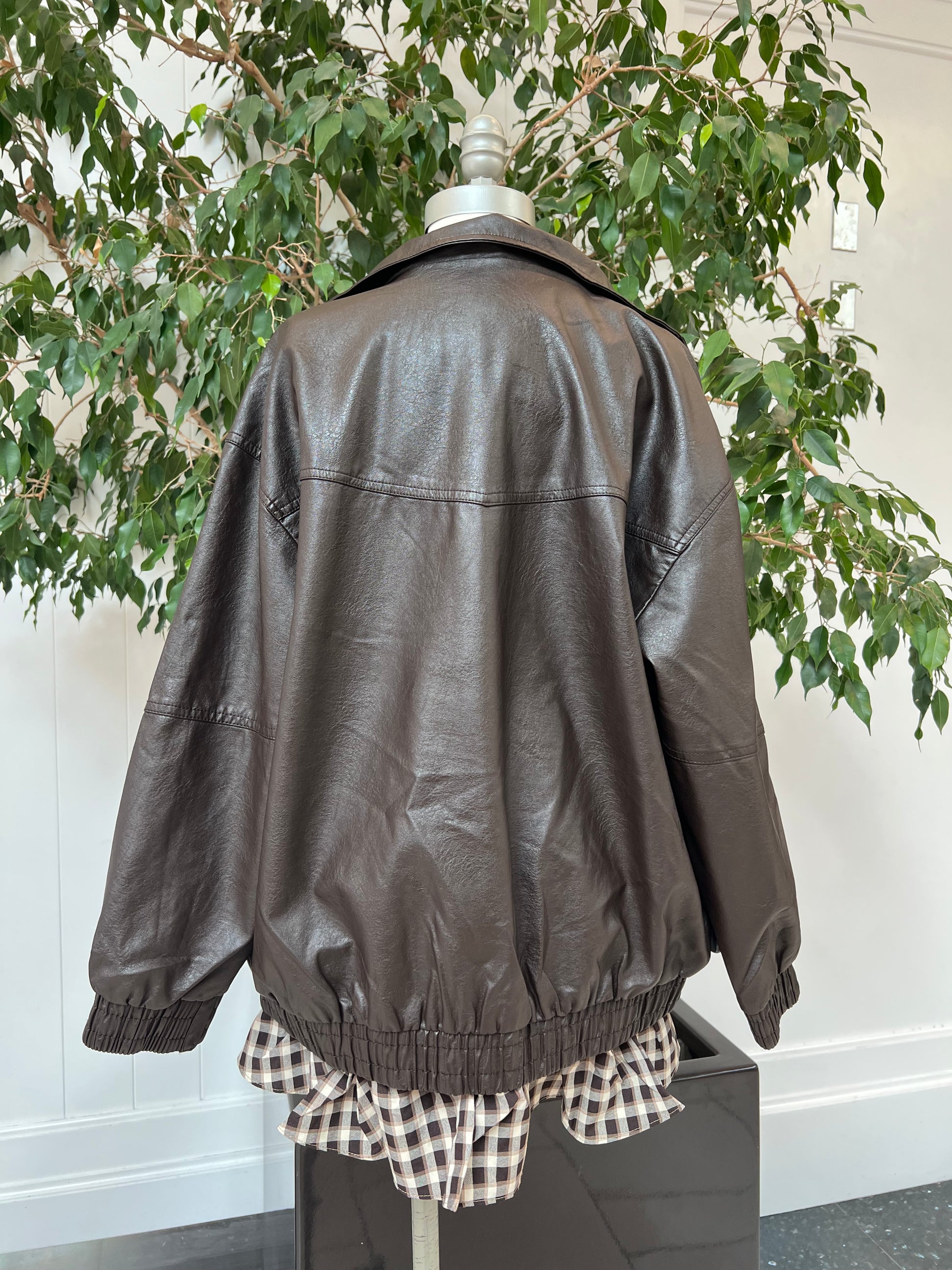 Stay warm and stylish with our Trendy In Leather Jacket. Made with cold brown leather, it's perfect for rainy days or a trendy look in the fall. With convenient side pockets and an elastic band on the low bottom and sleeves, it's a must-have for any fashion-forward individual.